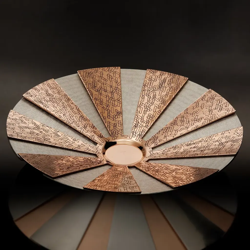 Fine basket designed with a lively pattern alternating between staggered sections of Copper and white Bronze alloys. This piece is made precious by the intricate and precise work done on its surface engraved and hammered by hand.