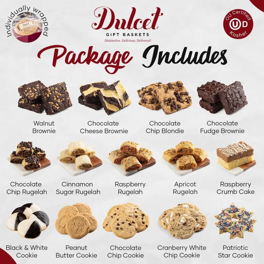 We surely think so! First impression matters most and therefore presentation is our top priority! We ensure that the basket arrives beautifully assembled to your recipient. The elegant presentation, freshness & flavor of the pastries are sure to delight your family and friends down to the last crumb! Package includes over 2 lbs. of pastries including 3 small star cookies topped with “star sprinkles, one large sprinkle cookie topped with red, white & blue sprinkles, 6 assorted flavor rugelach, 2 black & white cookies, 1 raspberry crumb cake, 1 chocolate cheese brownie, 1 chocolate chip blondies, 5 assorted flavor cookies – peanut butter & chocolate chip. Flavors may vary. Dulcet Gift Baskets Patriotic Gourmet Star Cookie, Brownie Gift Basket Ideal for Memorial Day 13 Pcs