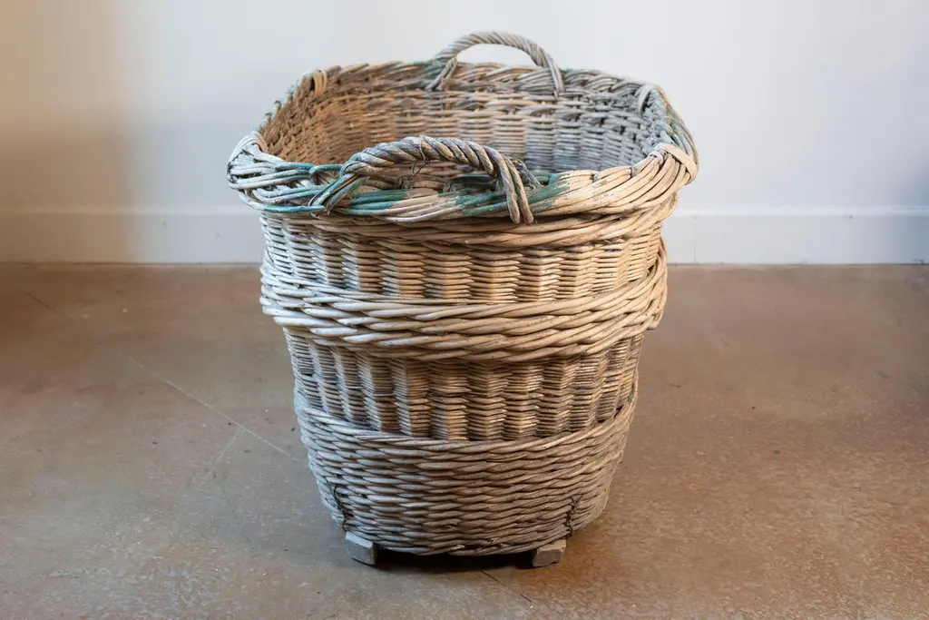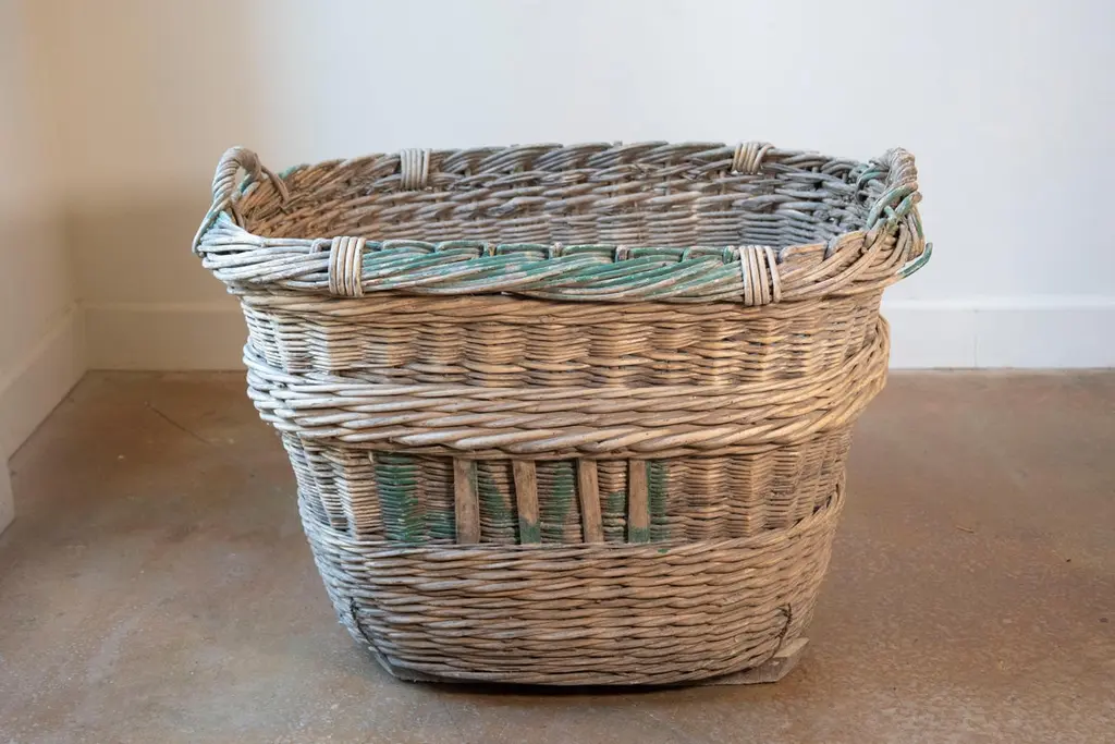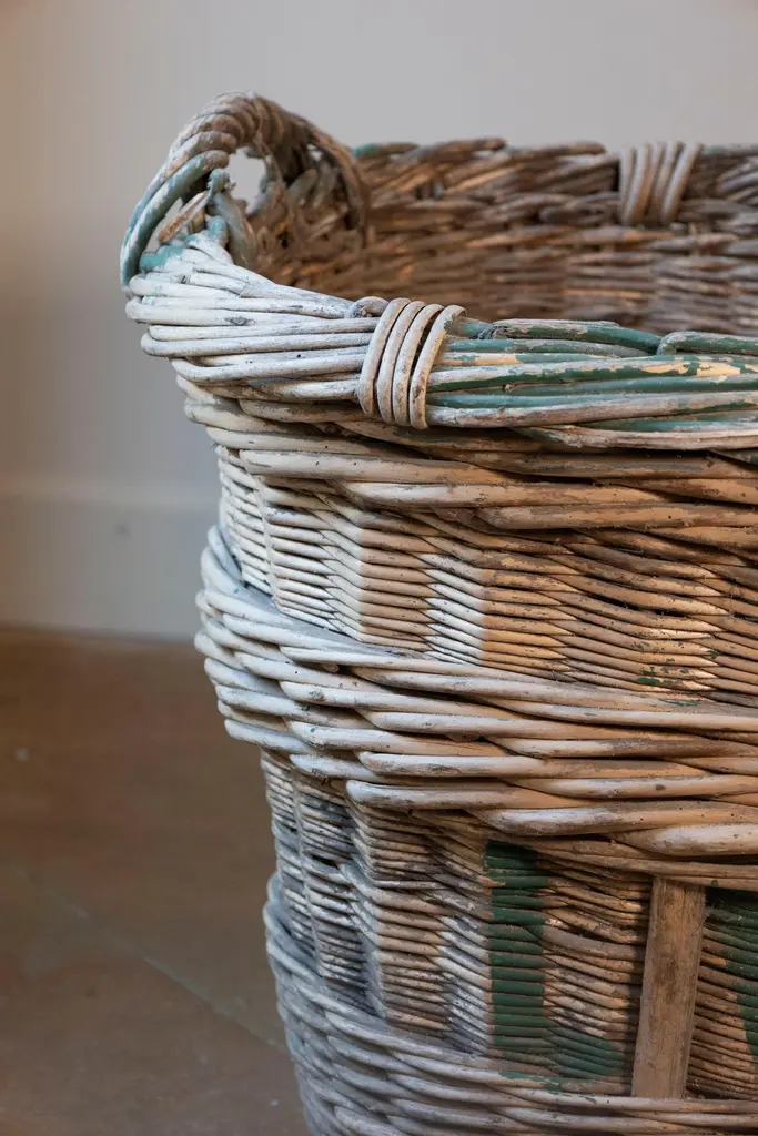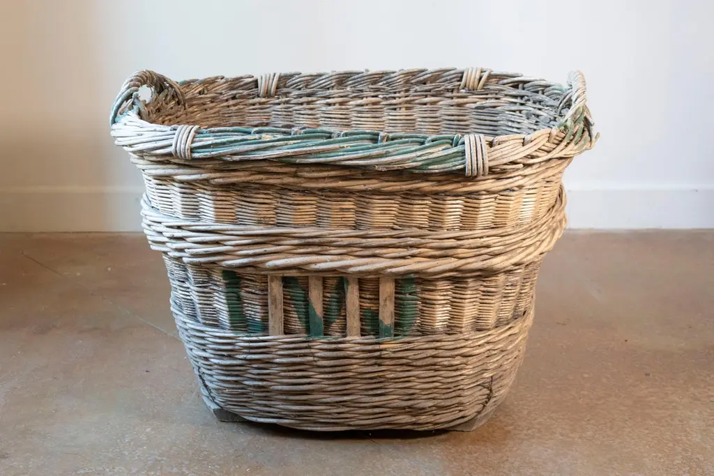 An authentic French grape harvesting basket from the 1940s, sourced from the vineyards of Champagne. Handwoven from sturdy willow, this generously sized basket features a distinctive twisted rim and reinforced handles designed for durability in the field during the demanding vendange (grape harvest).What sets this piece apart is the original green painted markings—likely the initials or domain code of the vineyard owner—still clearly visible on one side. Additional green accents are woven into the rim, adding a subtle but vibrant contrast against the naturally weathered willow.With its sculptural form and honest, utilitarian beauty, this basket serves as both a decorative accent and a functional storage solution. Ideal for holding firewood, towels, toys, or as a centerpiece in a wine cellar, mudroom, or garden space.