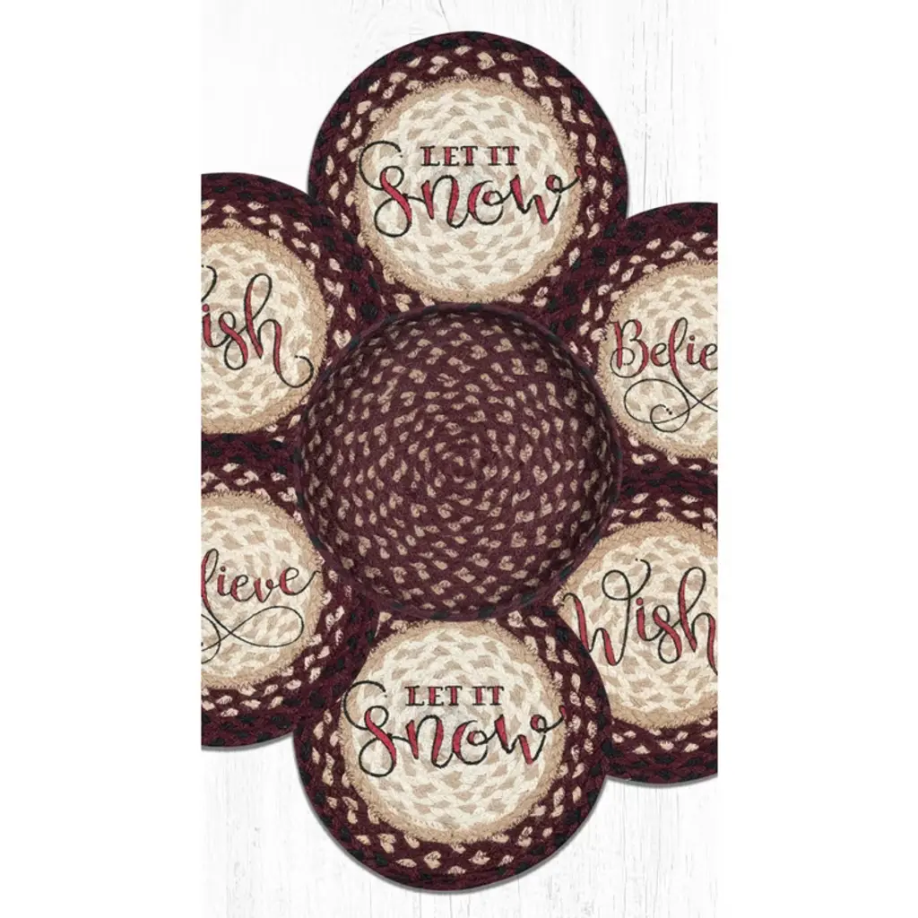 Earth Rugs Holiday Festive Round Trivets in Basket – Farmhouse Rustic Dining Set Crafted from eco-friendly, durable materials, these trivets are heat-resistant and designed to protect your counters and tabletops from hot cookware. At the same time, their festive prints bring warmth and rustic elegance to your kitchen or dining room. Key Features: Includes multiple round trivets in a beautifully crafted matching basket. Festive holiday-inspired designs bring seasonal charm to your kitchen and dining table. Generous 10"x10" size perfect for protecting surfaces from hot pots, pans, and dishes. Durable, eco-friendly craftsmanship made from sustainable woven materials. Versatile use as hot pads, table protectors, or rustic holiday decor accents. Rustic farmhouse style enhances lodge, cabin, or country-inspired interiors. Makes a thoughtful gift set for holidays, housewarmings, or festive gatherings.