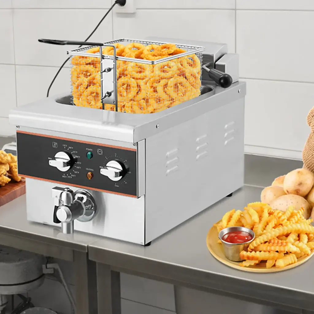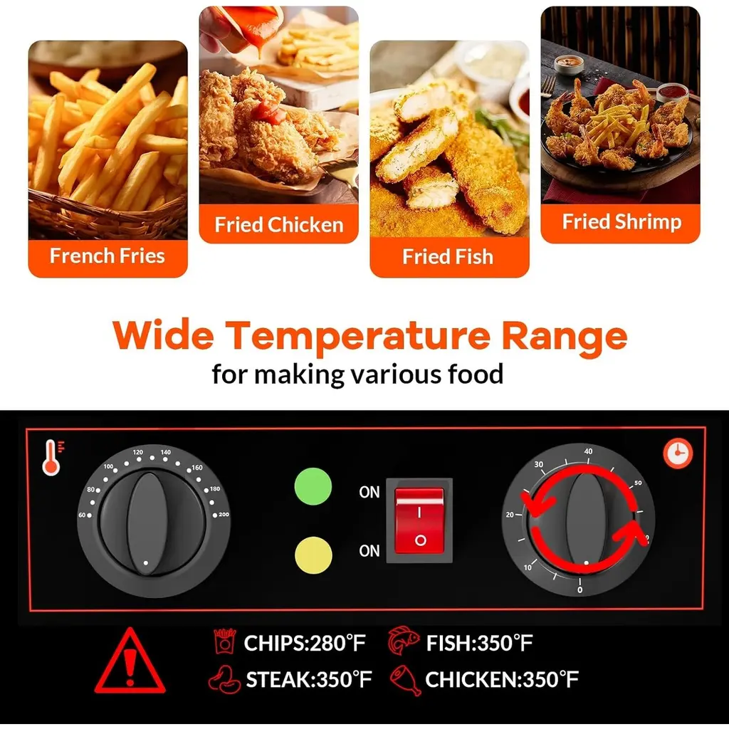Convenient and Safe: The lid effectively prevents hot oil from splashing, minimizing mess and ensuring a safer cooking experience without releasing thick smoke into the air. The handle of the frying basket is insulated to protect your hands from high temperatures during use. Additionally, the power light and heating indicator light clearly show when the machine is in operation, helping you avoid accidentally leaving it on after cooking. Durable and Easy to Clean: This fryer is made of stainless steel to prevent rust and is easy to clean. The thickened water tank is durable and removable for cleaning. The PVC non-slip feet at the bottom of the fryer make it firmly adhere to the desktop to avoid the machine sliding when in use. The frying basket is protected by a heating tube partition to prevent direct collision with the heating tube, extending the service life of the frying pan. Easy to Operate: One temperature knob controls the water tank separately, and then you can choose the right temperature according to what you want to fry. The fryer is designed with a U-shaped stainless steel heating tube to evenly distribute heat. Temperature range: 60℃ - 200℃ (140℉ - 392℉). Enjoy Healthy Food: The deep fryer is perfect for commercial use, such as restaurants, supermarkets, fast food stalls, snack bars, parties, etc. Suitable for buffalo wings, chicken, dumplings, egg rolls, shrimp rolls, mozzarella cheese sticks, jalapenos, etc. Help you cook a table of mouth-watering dishes in a short time.