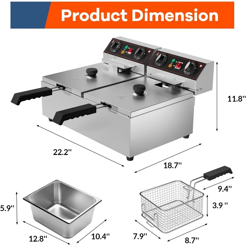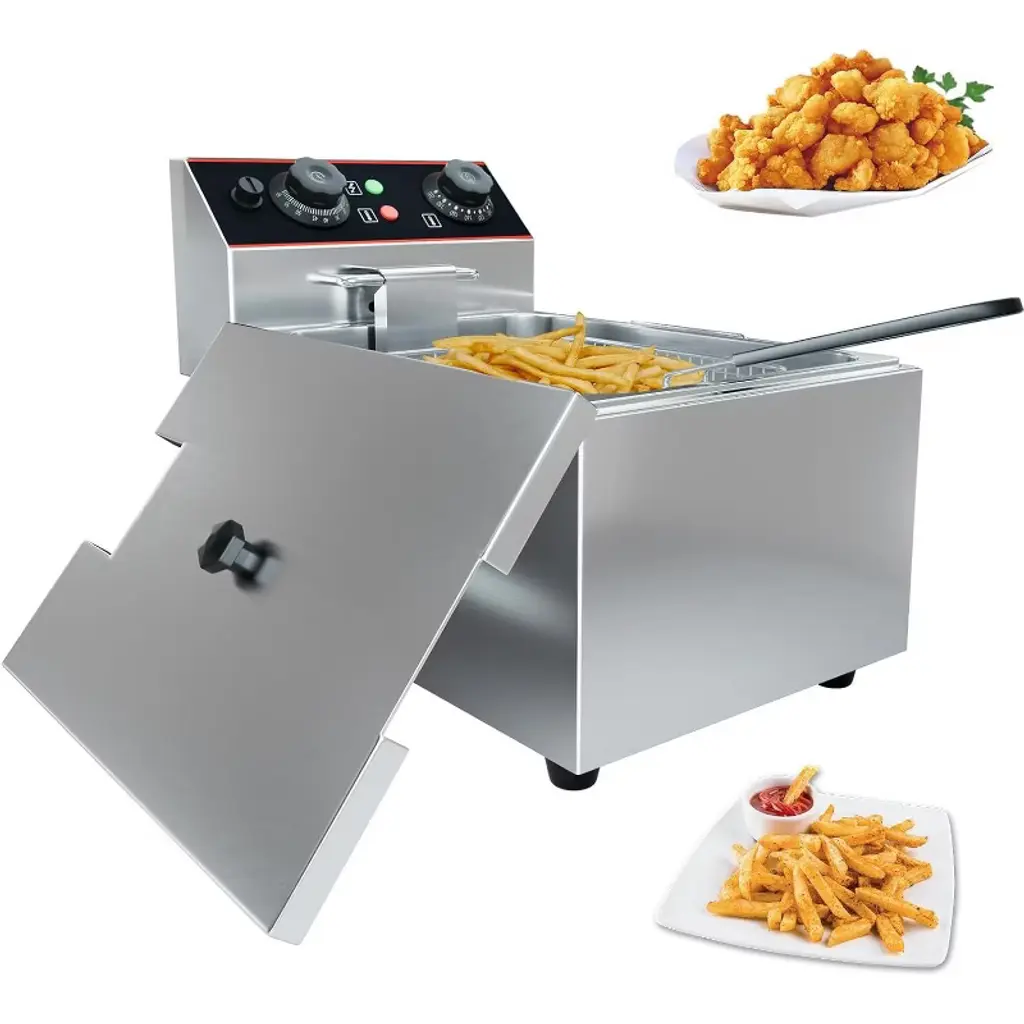 Convenient and Safe: The lid effectively prevents hot oil from splashing, minimizing mess and ensuring a safer cooking experience without releasing thick smoke into the air. The handle of the frying basket is insulated to protect your hands from high temperatures during use. Additionally, the power light and heating indicator light clearly show when the machine is in operation, helping you avoid accidentally leaving it on after cooking. Durable and Easy to Clean: This fryer is made of stainless steel to prevent rust and is easy to clean. The thickened water tank is durable and removable for cleaning. The PVC non-slip feet at the bottom of the fryer make it firmly adhere to the desktop to avoid the machine sliding when in use. The frying basket is protected by a heating tube partition to prevent direct collision with the heating tube, extending the service life of the frying pan. Easy to Operate: One temperature knob controls the water tank separately, and then you can choose the right temperature according to what you want to fry. The fryer is designed with a U-shaped stainless steel heating tube to evenly distribute heat. Temperature range: 60℃ - 200℃ (140℉ - 392℉). Enjoy Healthy Food: The deep fryer is perfect for commercial use, such as restaurants, supermarkets, fast food stalls, snack bars, parties, etc. Suitable for buffalo wings, chicken, dumplings, egg rolls, shrimp rolls, mozzarella cheese sticks, jalapenos, etc. Help you cook a table of mouth-watering dishes in a short time.