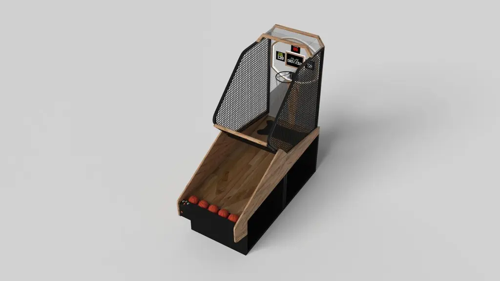 Supported by two rectangular open pedestals as the base, this handcrafted basketball game is modern and minimalistic with its combination of simple, geometric forms. Viewed from the front, the use of negative space is evident; viewed from the side, the base appears to be one solid form. A hand-sanded hardwood top frames the game itself, allowing for the perfect combination of superior playability and irrefutable style. Digital components, including sound effects and LED lights, and built in.Size:99"L x 39"W x 101" H