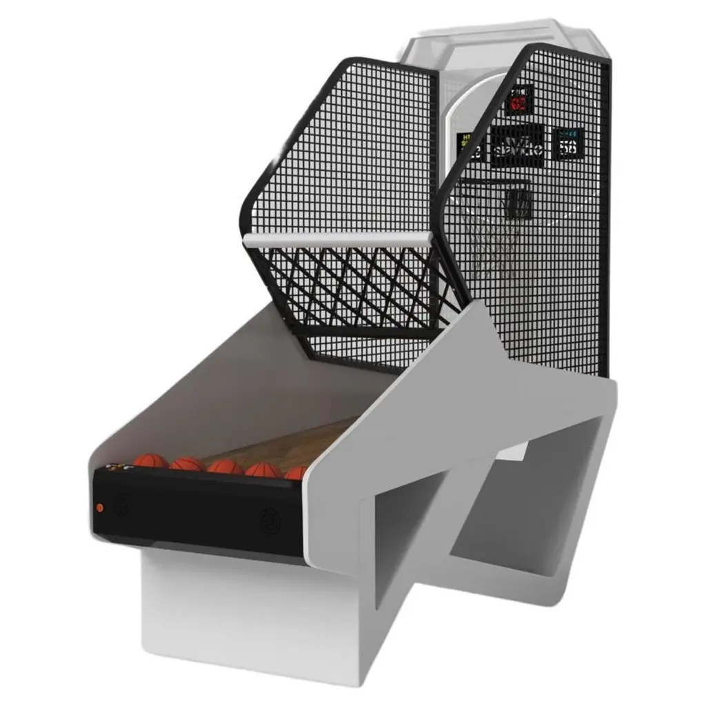 Supported by two rectangular open pedestals as the base, this handcrafted basketball game is modern and minimalistic with its combination of simple, geometric forms. Viewed from the front, the use of negative space is evident; viewed from the side, the base appears to be one solid form. A hand-sanded hardwood top frames the game itself, allowing for the perfect combination of superior playability and irrefutable style. Digital components, including sound effects and LED lights, and built in.Size:99"L x 39"W x 101" H