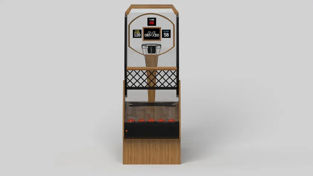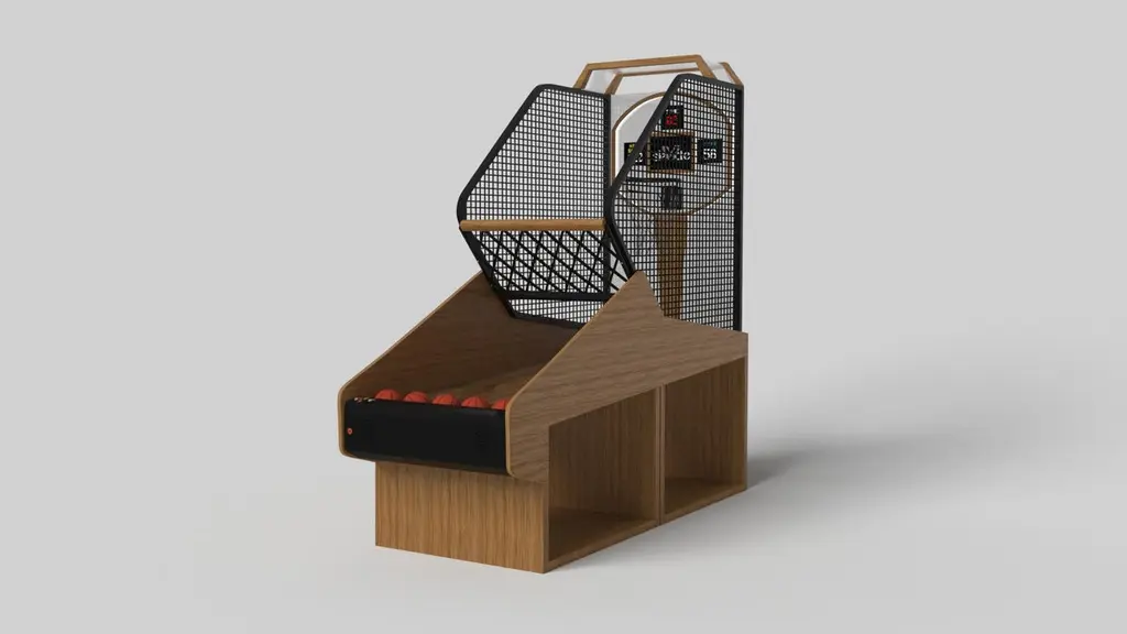 Supported by two rectangular open pedestals as the base, this handcrafted basketball game is modern and minimalistic with its combination of simple, geometric forms. Viewed from the front, the use of negative space is evident; viewed from the side, the base appears to be one solid form. A hand-sanded hardwood top frames the game itself, allowing for the perfect combination of superior playability and irrefutable style. Digital components, including sound effects and LED lights, and built in.Size:99"L x 39"W x 101" H