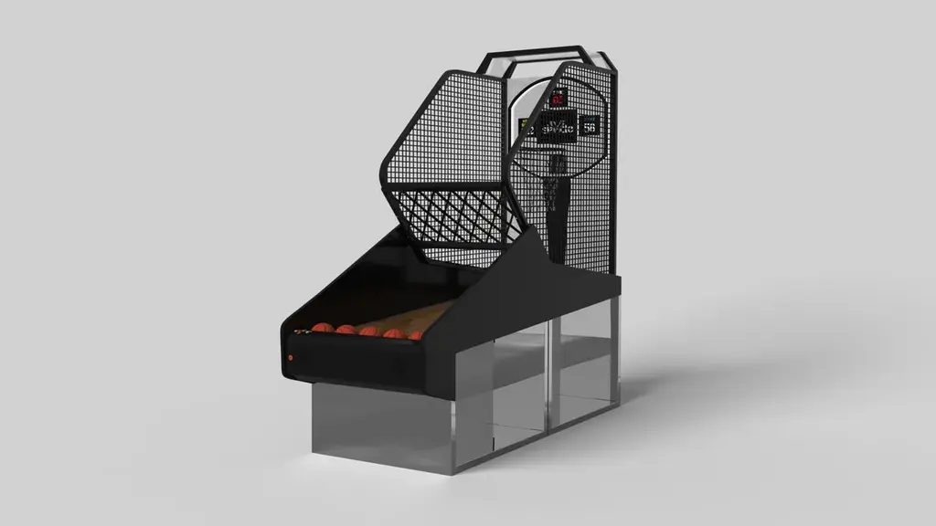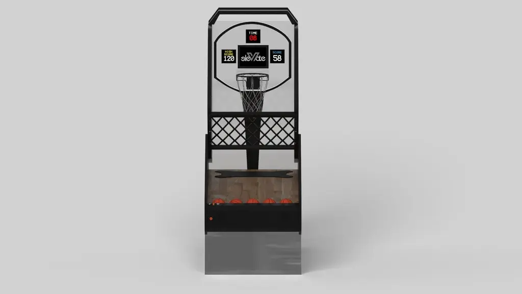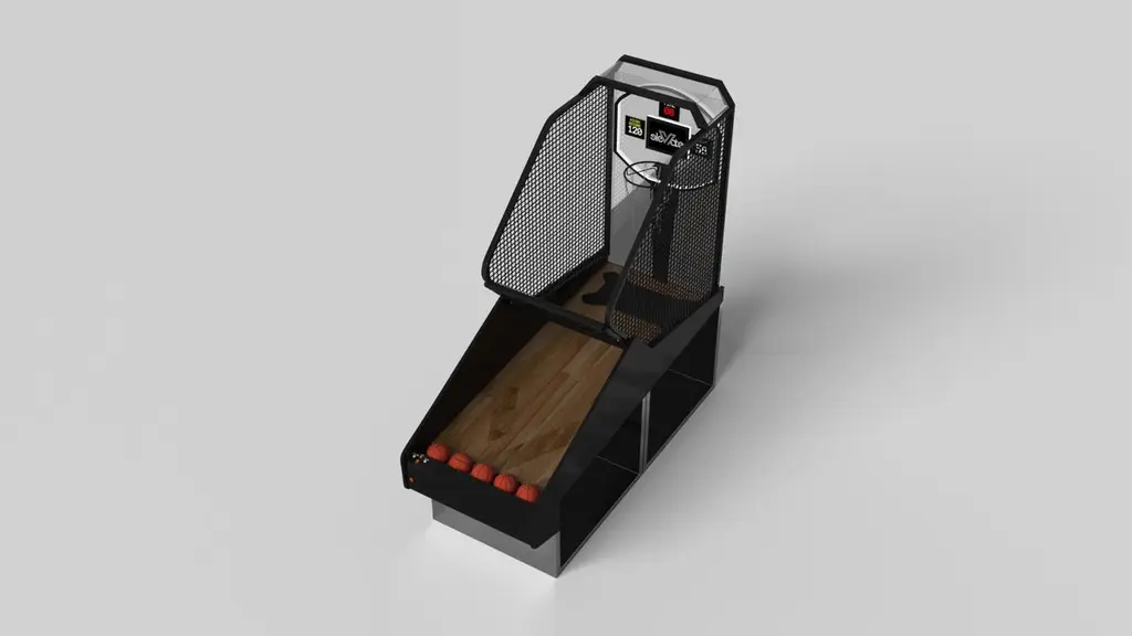 Supported by two rectangular open pedestals as the base, this handcrafted basketball game is modern and minimalistic with its combination of simple, geometric forms. Viewed from the front, the use of negative space is evident; viewed from the side, the base appears to be one solid form. A hand-sanded hardwood top frames the game itself, allowing for the perfect combination of superior playability and irrefutable style. Digital components, including sound effects and LED lights, and built in.Size:99"L x 39"W x 101" H