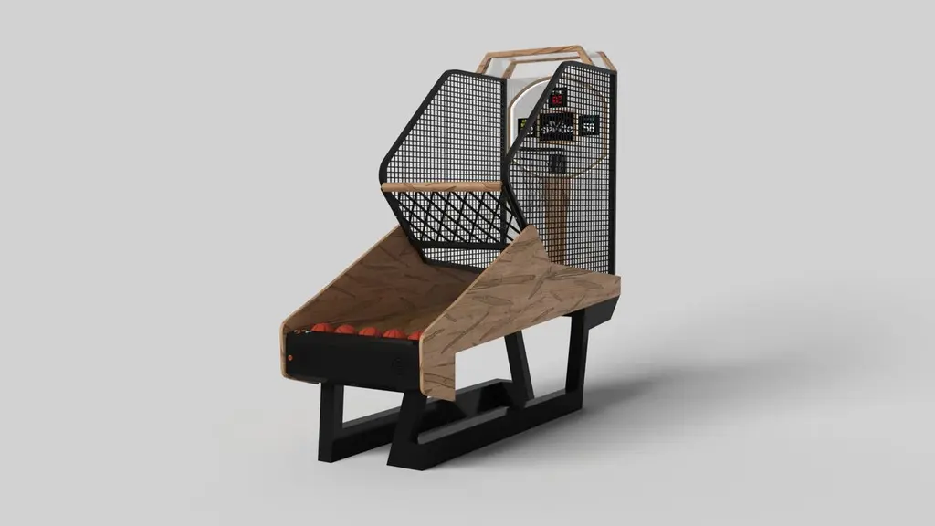 A contemporary composition of clean lines and sleek edges, the Trinity basketball game is an elegant expression of modern design. Handcrafted and detailed with built-in digital components, this game offers statement-making style with sharp angles that form three distinct triangles when viewed from the side. When viewed from each end, a Z-shaped pattern takes form, giving it bold, geometric appeal to fits seamlessly into any modern room design.Size:99"L x 39"W x 101" H