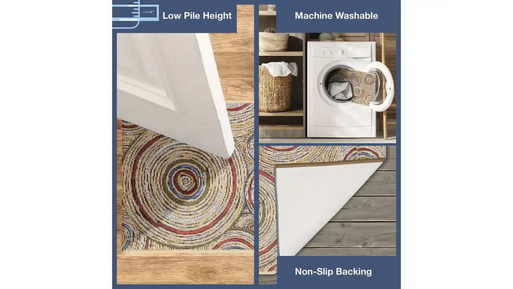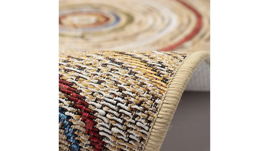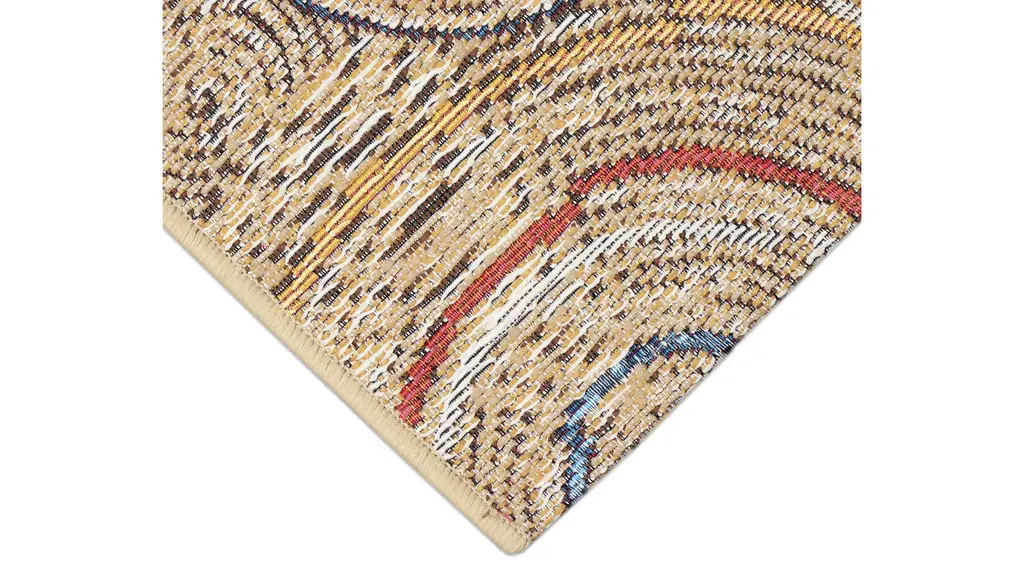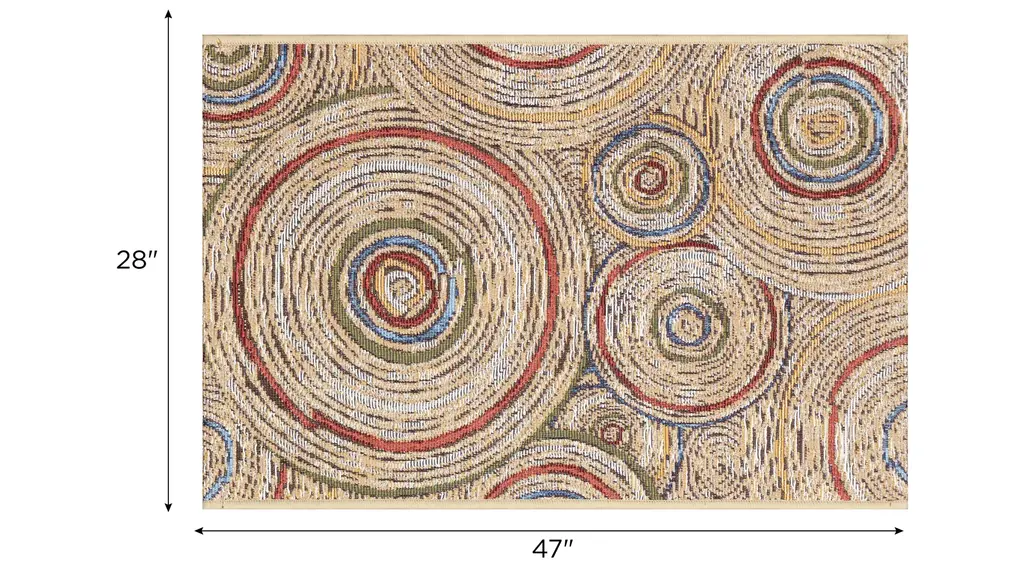 The Esencia Basket Circles Indoor/Outdoor Mat features contemporary medallion like geometric circles in blue, green, red and orange accents on a natural background.