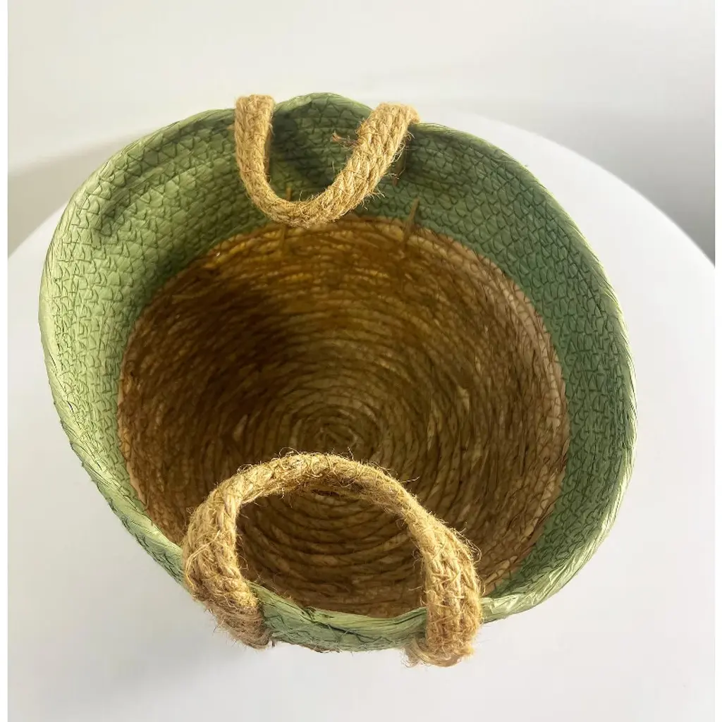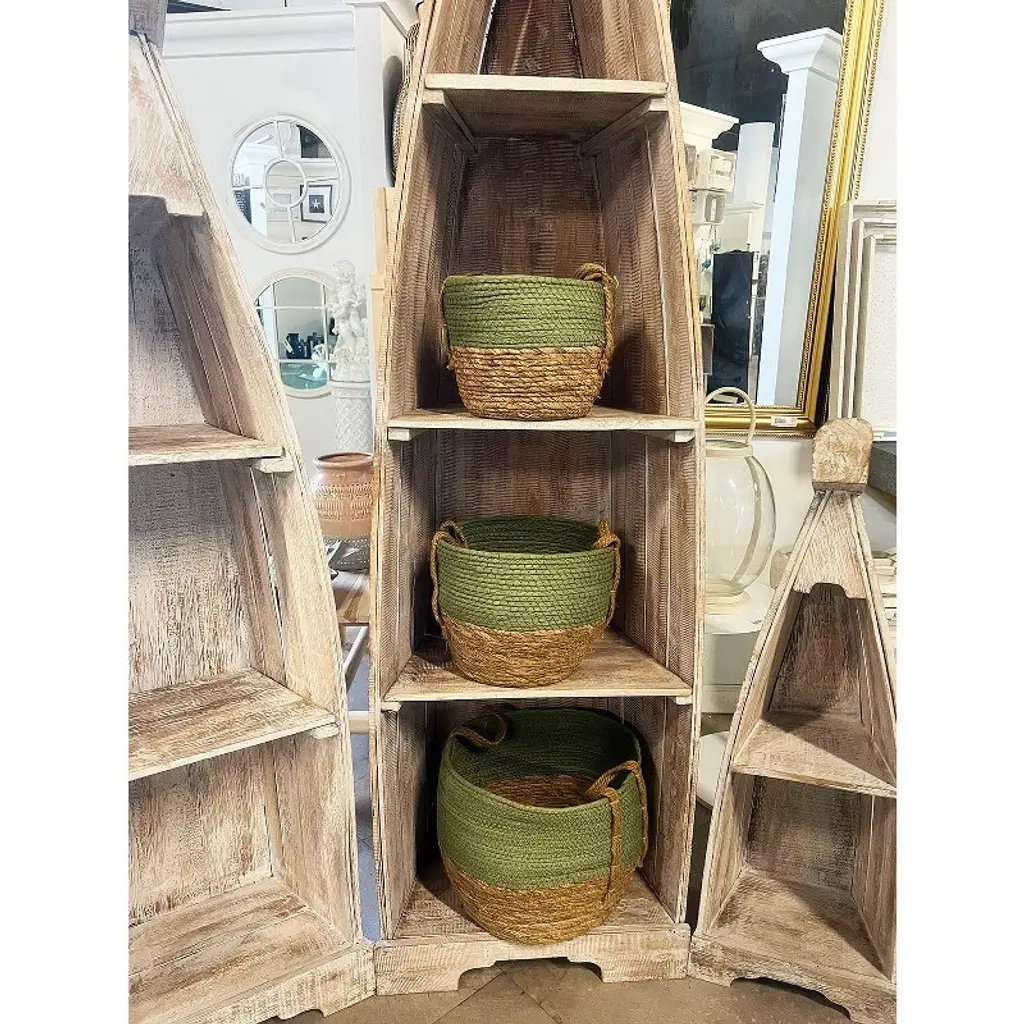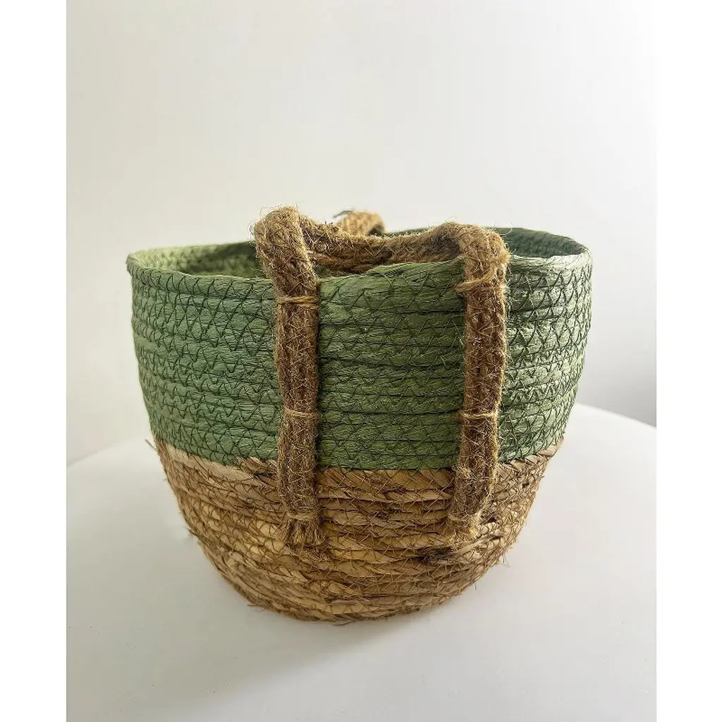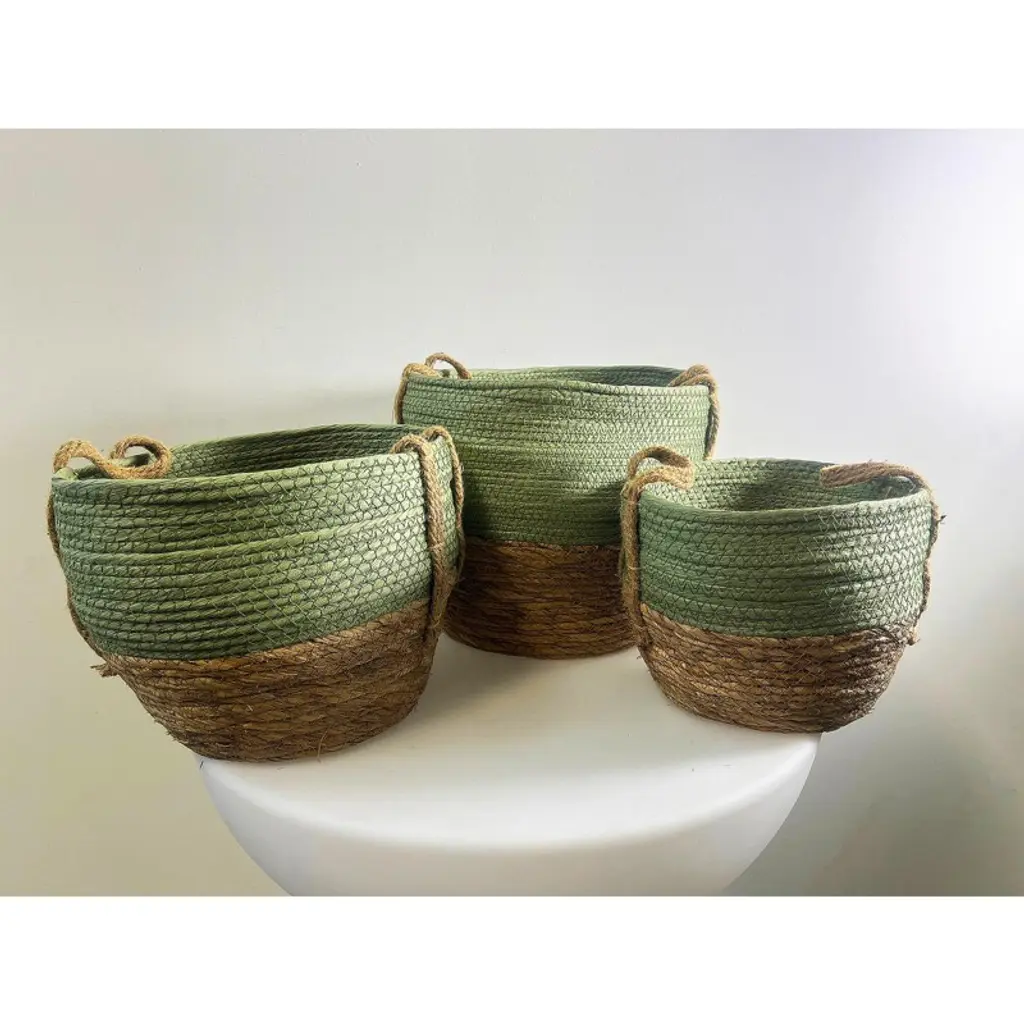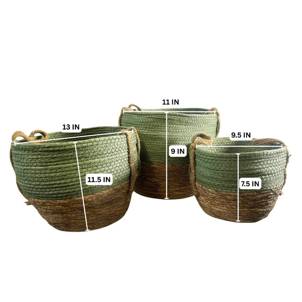 The Essential Decor & Beyond 3-Piece Set Seagrass and Paulownia Wood Basket with Handle Indoor Decor features three round baskets crafted with a blend of seagrass weaving and paulownia wood accents. Designed to bring a natural and rustic charm to any interior space, these versatile baskets are perfect for stylish storage, organization, or decorative display.