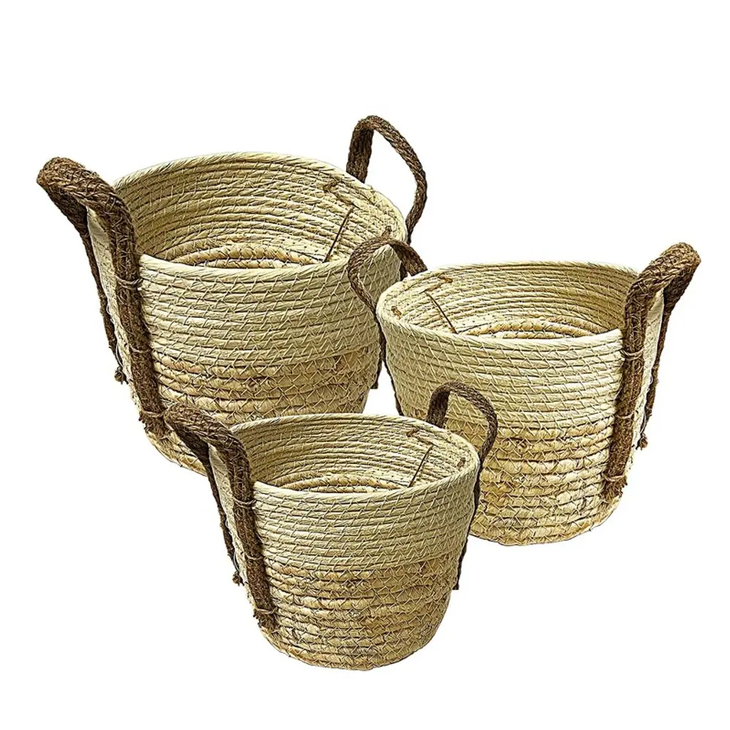 Essential Decor & Beyond 3-piece Set Seagrass And Paulownia Wood Basket With Handle Indoor Decor