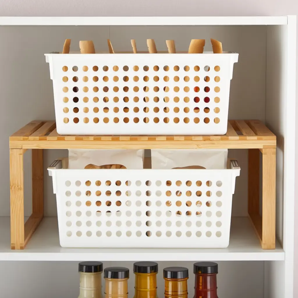 Keep your spaces neat and organized with this set of 4 baskets for bathroom organizing. These storage bins feature convenient gray handles for easy handling and transport. Designed for small items, these baskets are perfect for organizing your kitchen and bathroom shelves. They can be nested together when not in use, saving you valuable storage space. Each basket measures 5 inches, providing just the right size for your organizing needs.