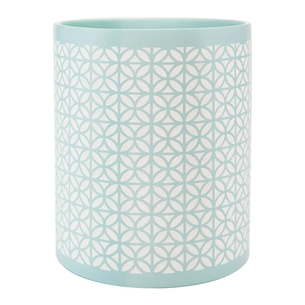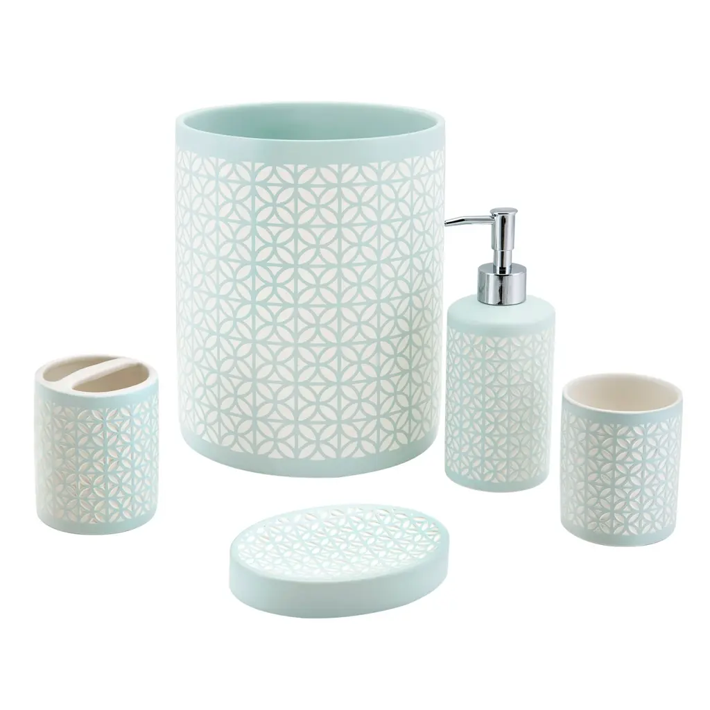 The intricate textural detailing and soft finish of the Felix Bath Accessories bring a serene and peaceful feeling to your spa-like bathroom. The Tumbler, Toothbrush Holder, Soap Dish and Lotion Pump are made of sandblasted ceramic for a distressed finish in a textural diamond motif. The complementary Wastebasket is made of embossed resin also in a textural diamond motif. Each piece is sold separately. Available in white, aqua blue and blush pink. Hand wash.