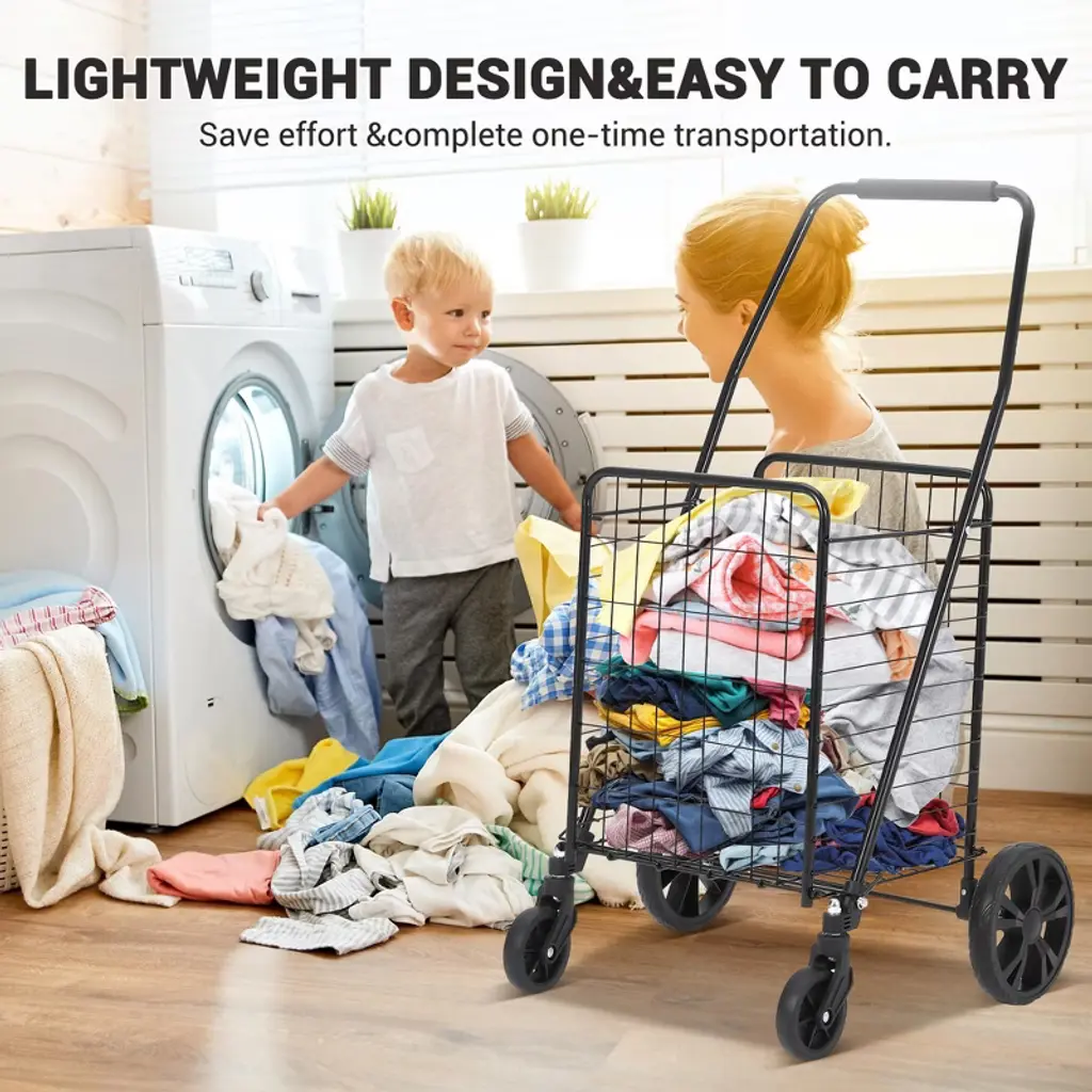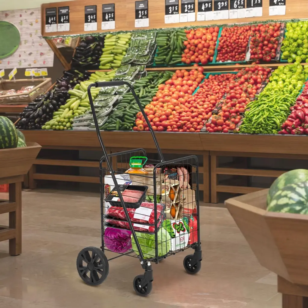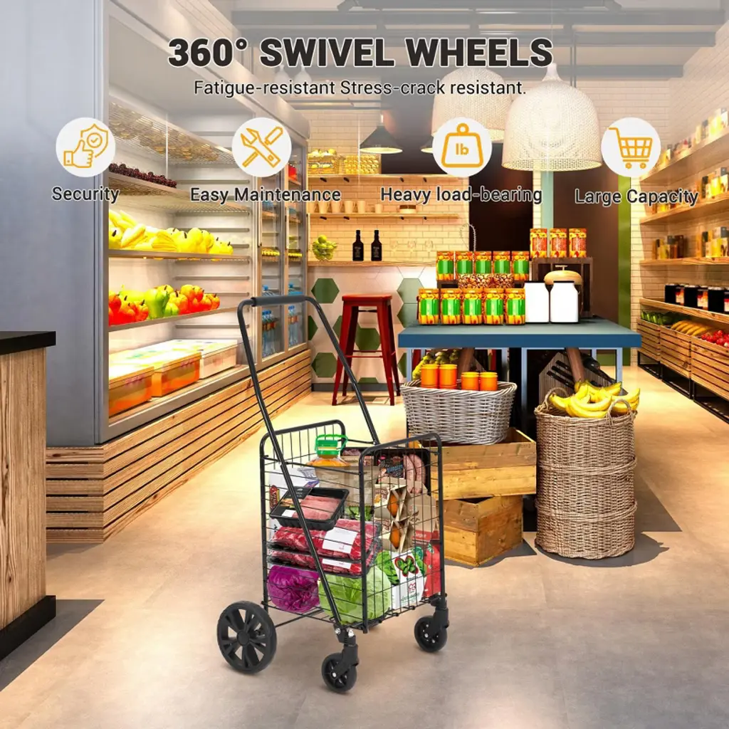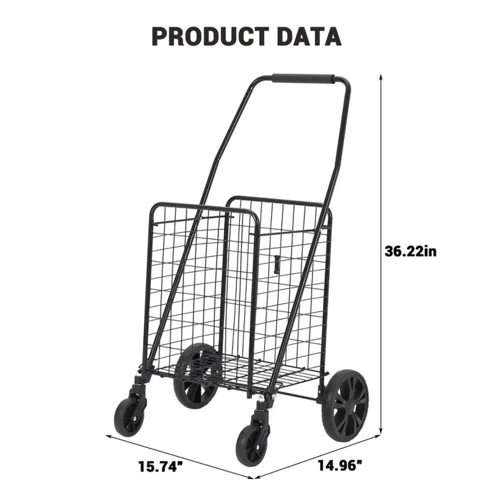 Tired of struggling with heavy bags or making multiple trips from the store? Discover how a folding shopping cart with a spacious basket and smooth-rolling wheels could make your errands faster, easier, and more comfortable every time you head out.Highlights at a Glance: - Heavy duty steel frame supports groceries, laundry, and more with reliable strength - Spacious wire basket holds all your shopping or daily essentials in one trip - Folds flat for easy storage; lightweight design is simple to carry and transport - 360° swivel wheels and rear wheels make maneuvering smooth- Comfortable handle provides better grip and control wherever you go - Quick setup with clear instructions and labeled parts for hassle-free assembly - Perfect for shopping, errands, moving supplies, or campus lifeSpecification:Product: Folding Shopping Cart Dimensions: 15.74x14.96x36.22 in(40x38x92 cm)Weight Capacity: 110 LB(50 kg) Basket Capacity: 22 gal(83.27 L)Material: Steel Colour: Black Friendly Note:For easy setup, please follow the instructions included in the package.Ensure all parts are securely tightened before first use.Always push your shopping cart; avoid pulling at sharp angles.Store the shopping cart in a dry area when not in use.Packing List:1 x Shopping Cart 1 x Hardware Pack1 x Assembly Instruction Manual