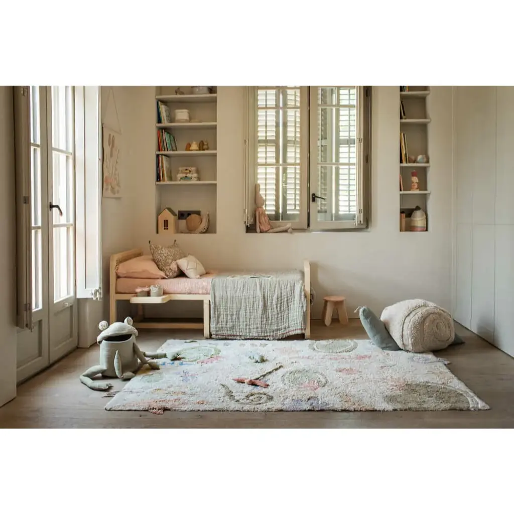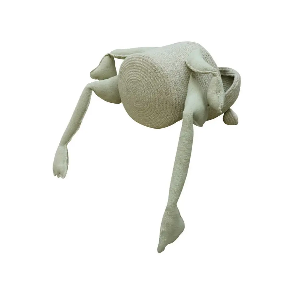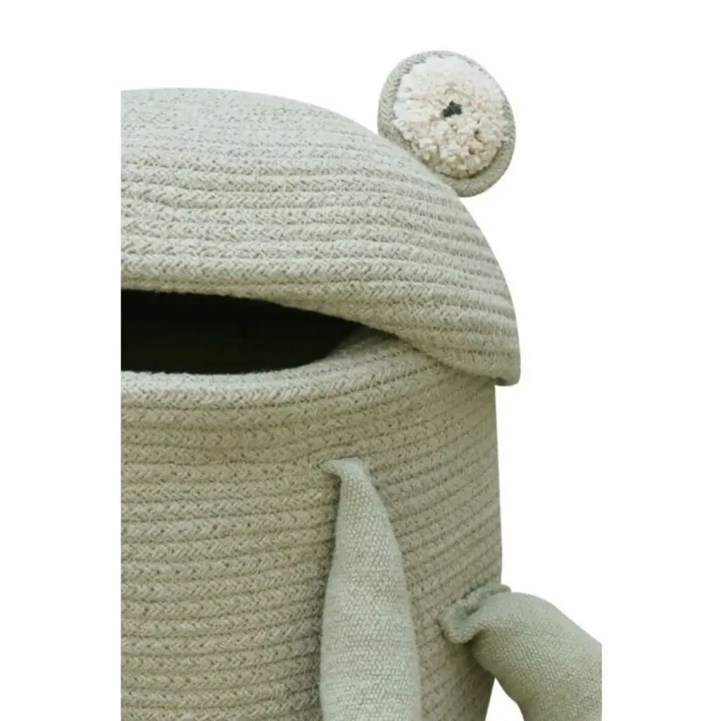 Ribbit!! This frog basket is so sweet and would be the perfect addition to a nursery or playroom. Kids love helping to clean up their toys, while putting them in the frog's mouth. Composed of braided cord cotton, finished in olive green with the sweetest details.