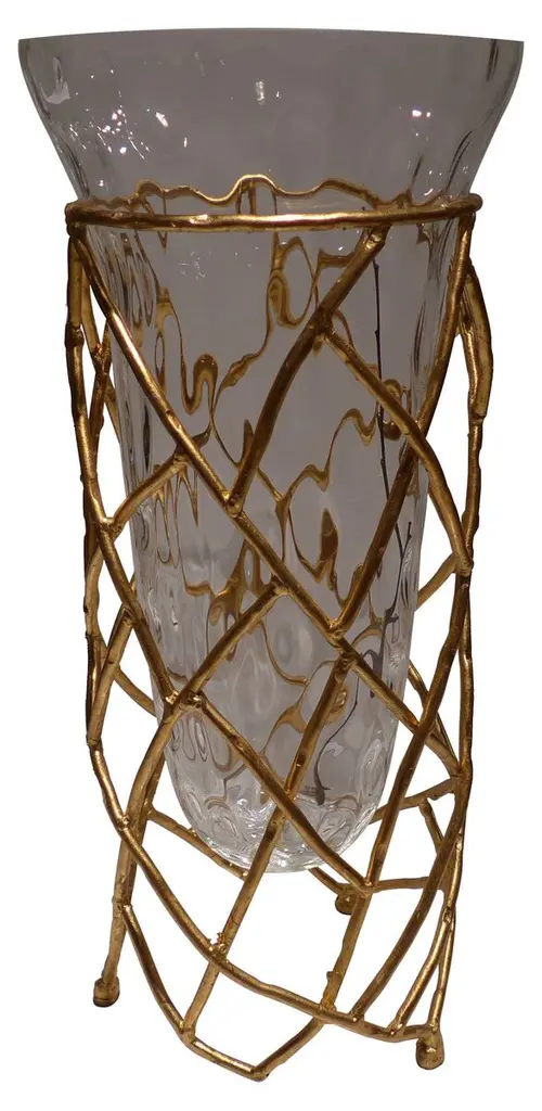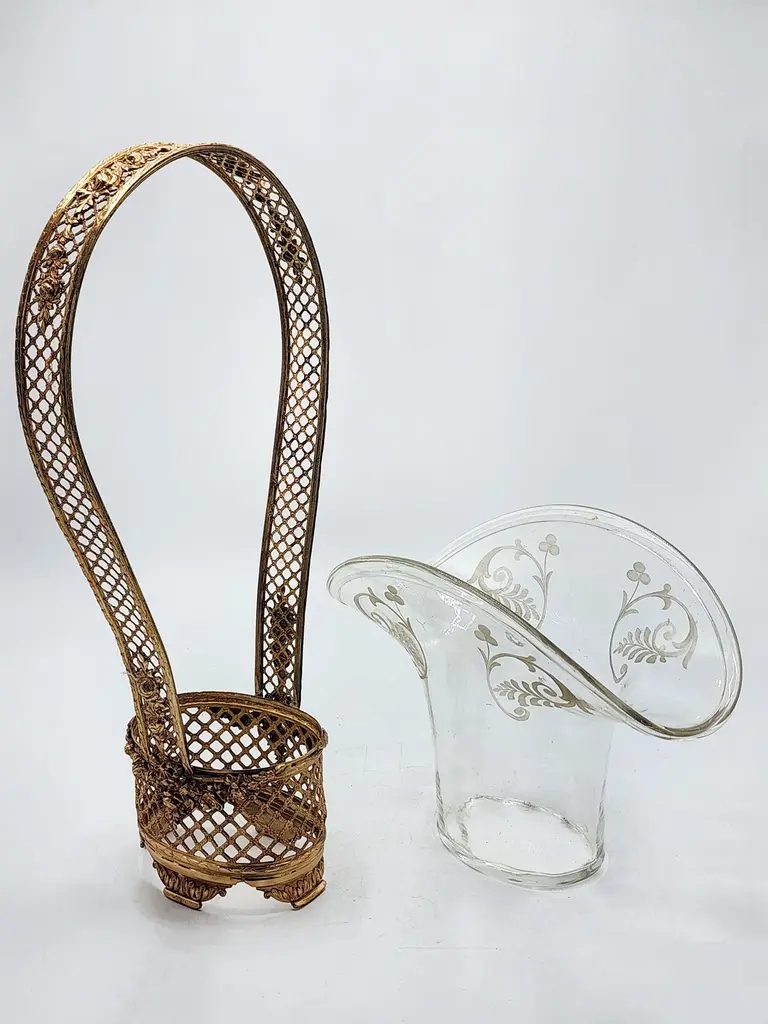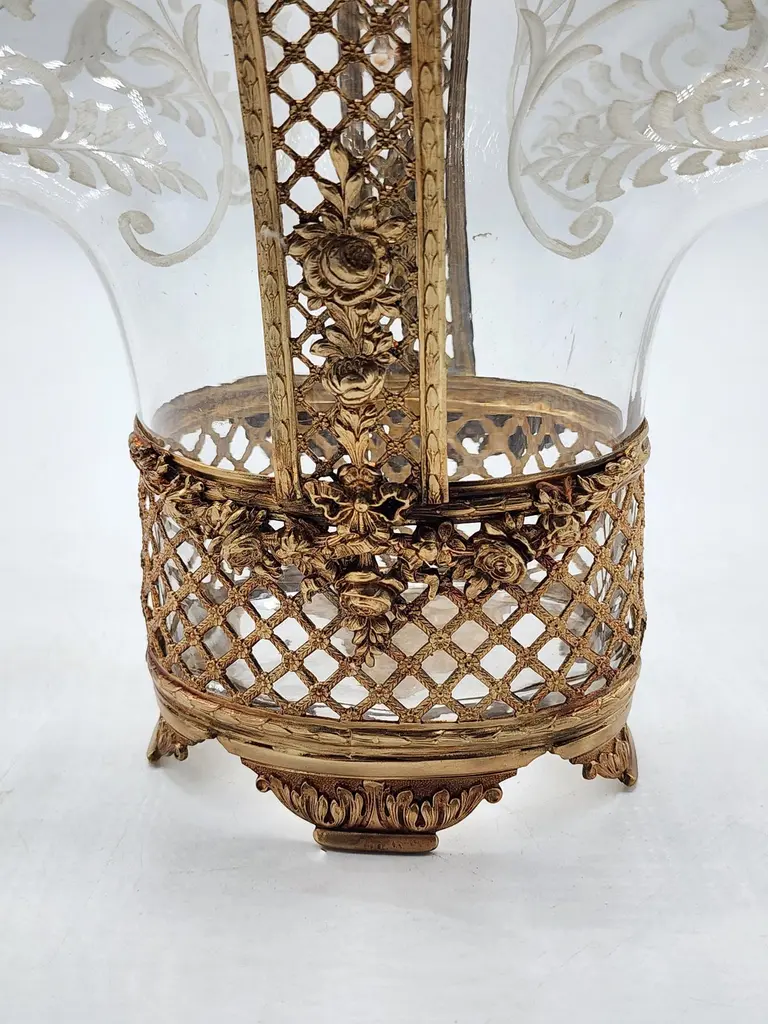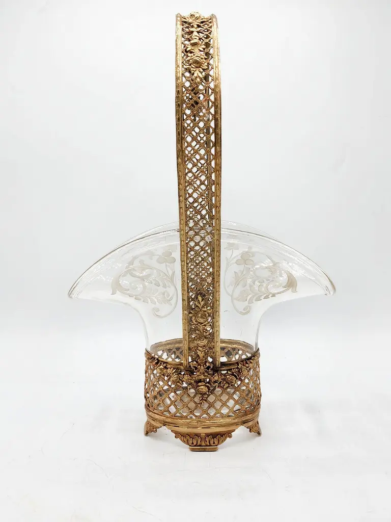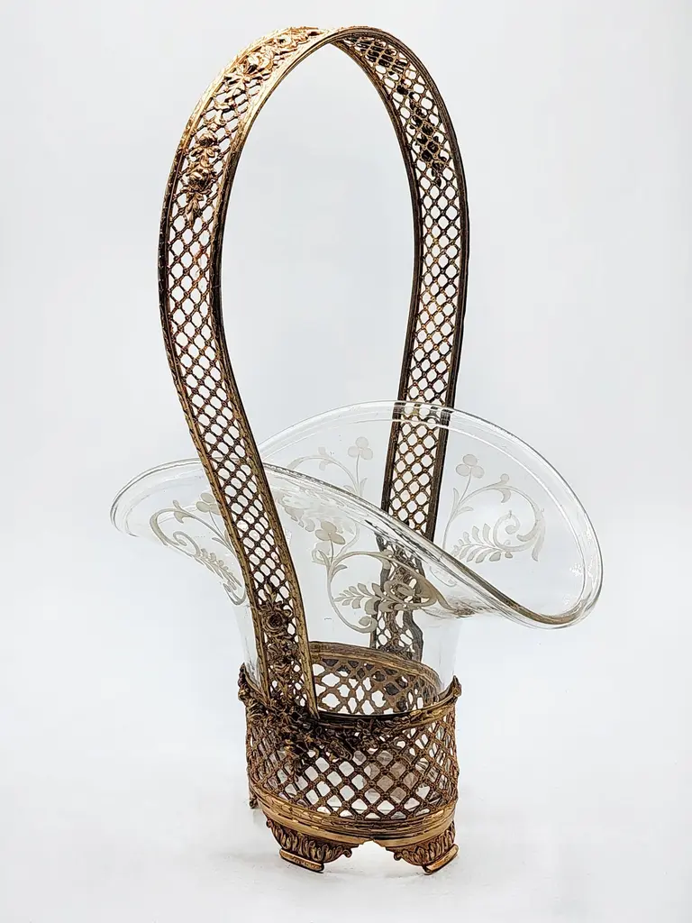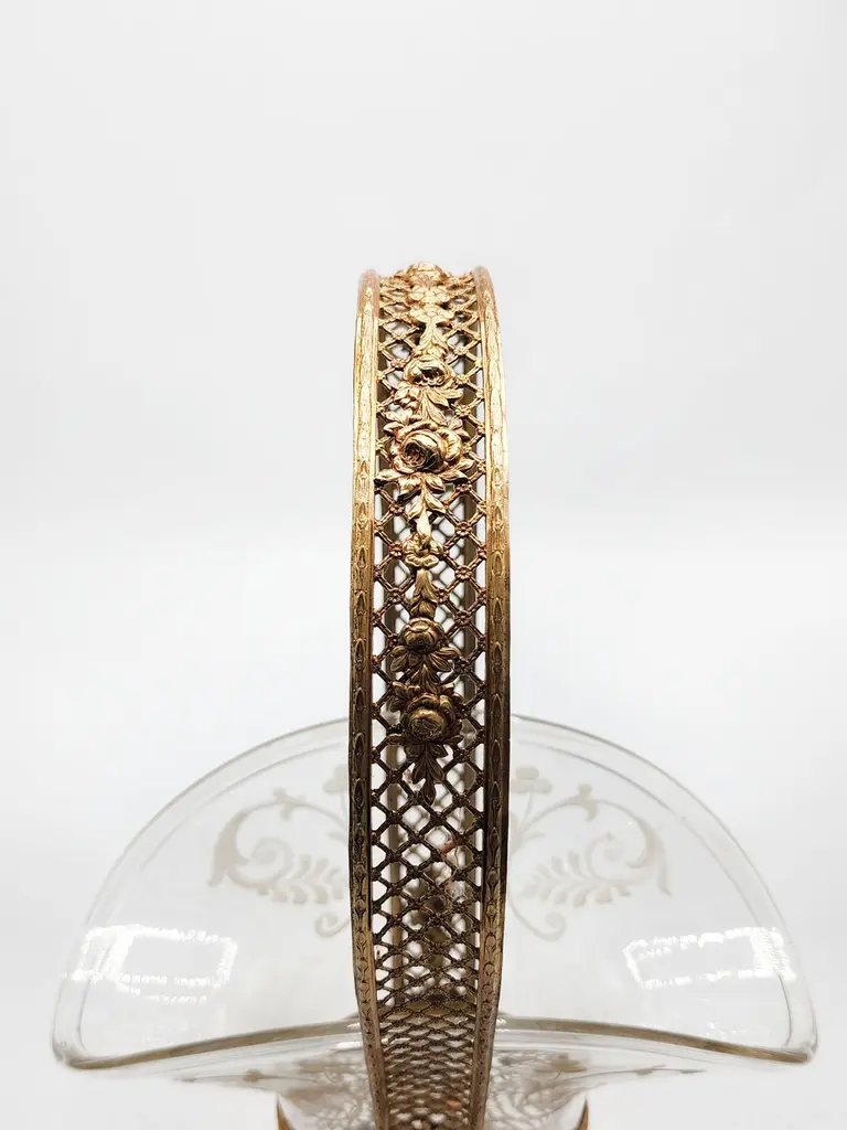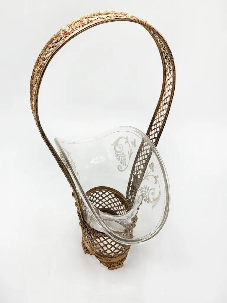 French Centerpiece Gilded Bronze Weave Open Crystal BasketBeautiful centerpiece in gilded bronze interwoven with flower details on the glass and on the handles.Measures:Height: 38.5 centimetersLength: 25 centimetersDepth: 18.5 centimeters