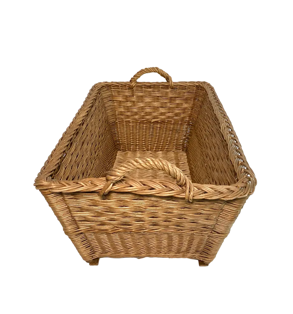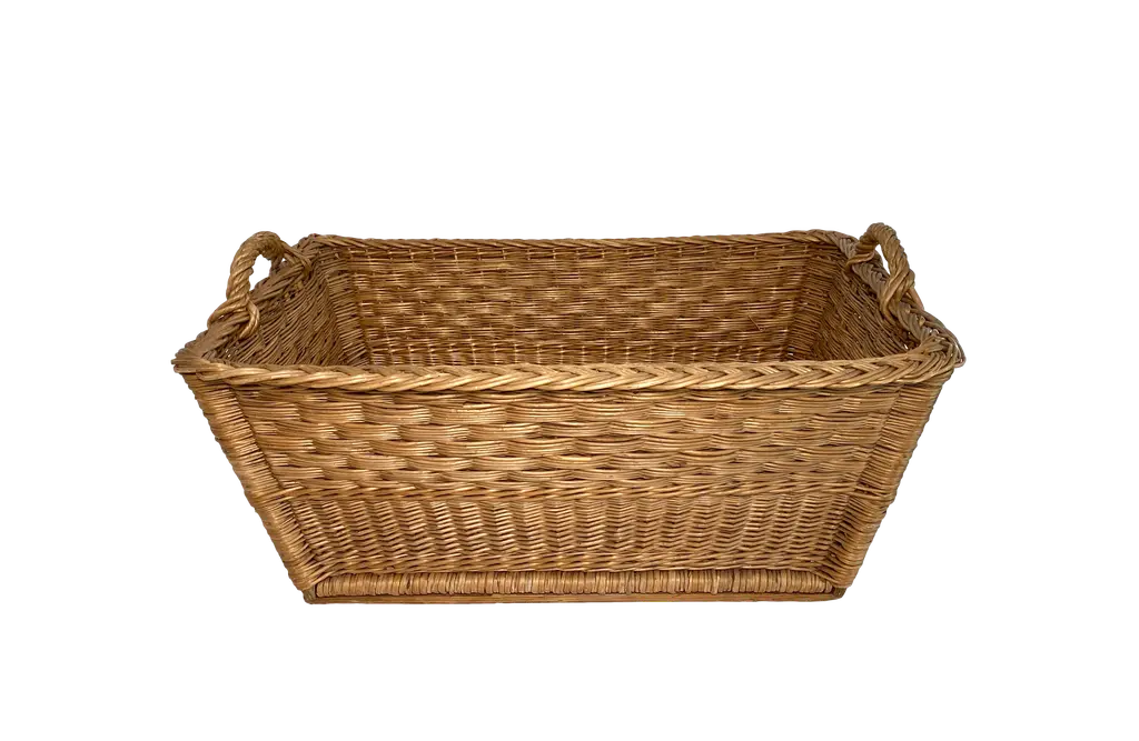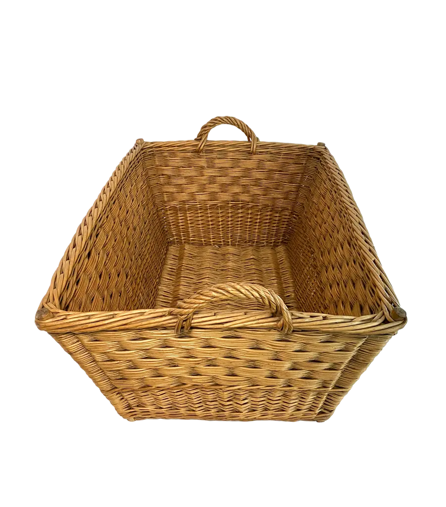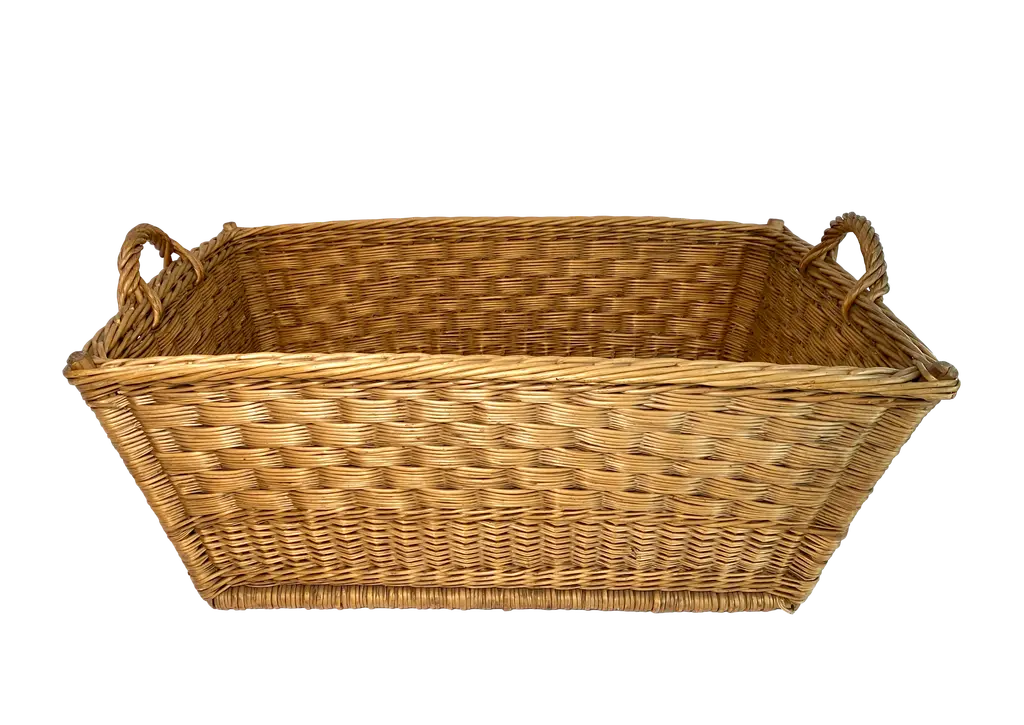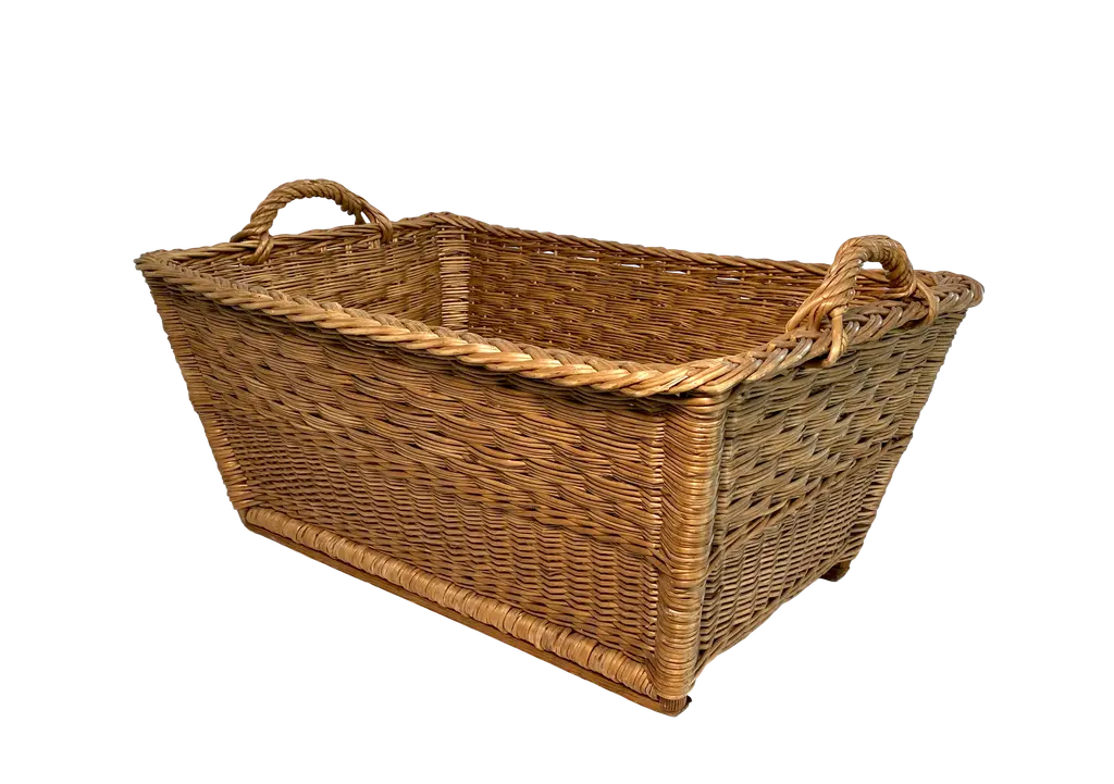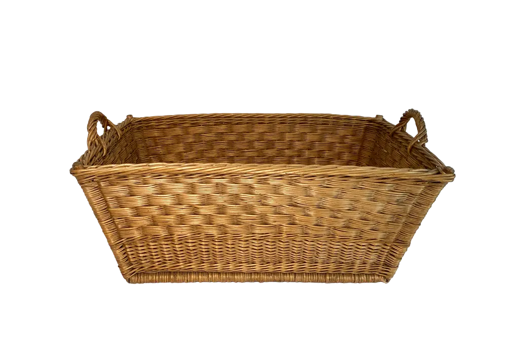Extra large traditional 1960s woven wicker French market basket with handles and braided trim. Height of basket, 12.5". We pour through stacks of these baskets to find the best preserved pieces. There are a variety of sizes currently available in my inventory. Each has a different woven pattern.