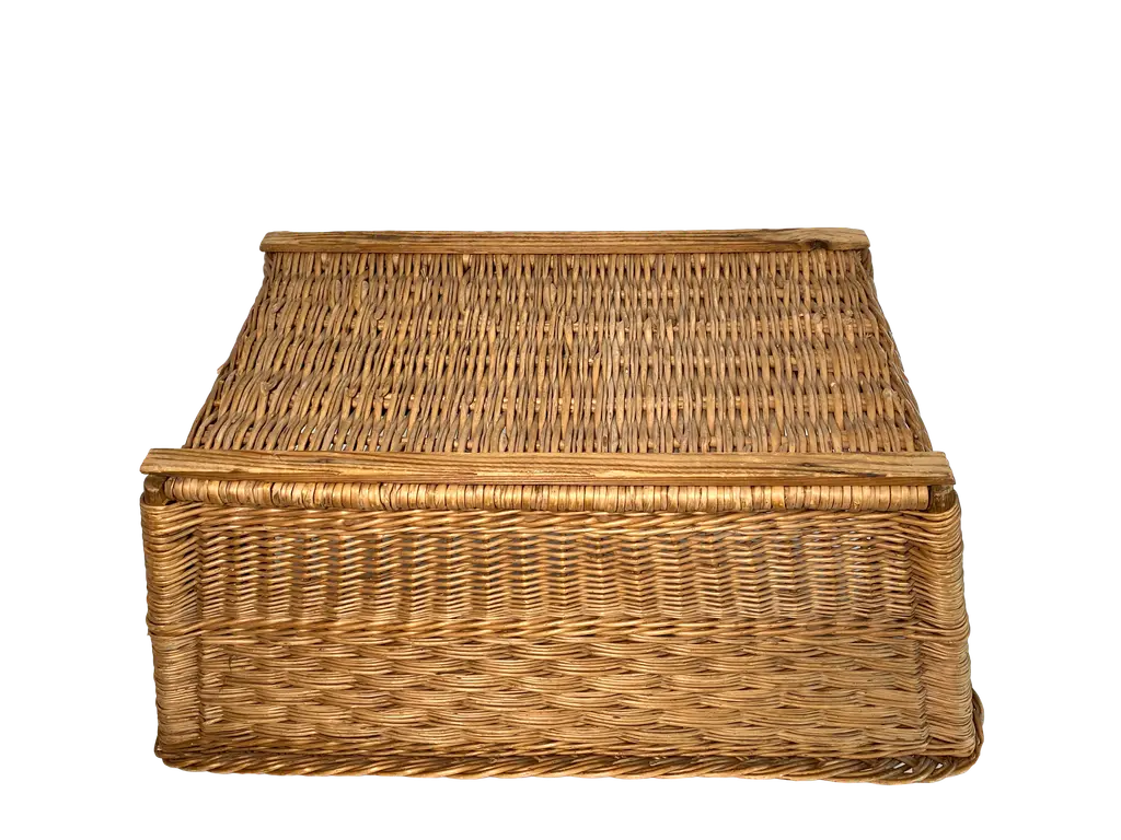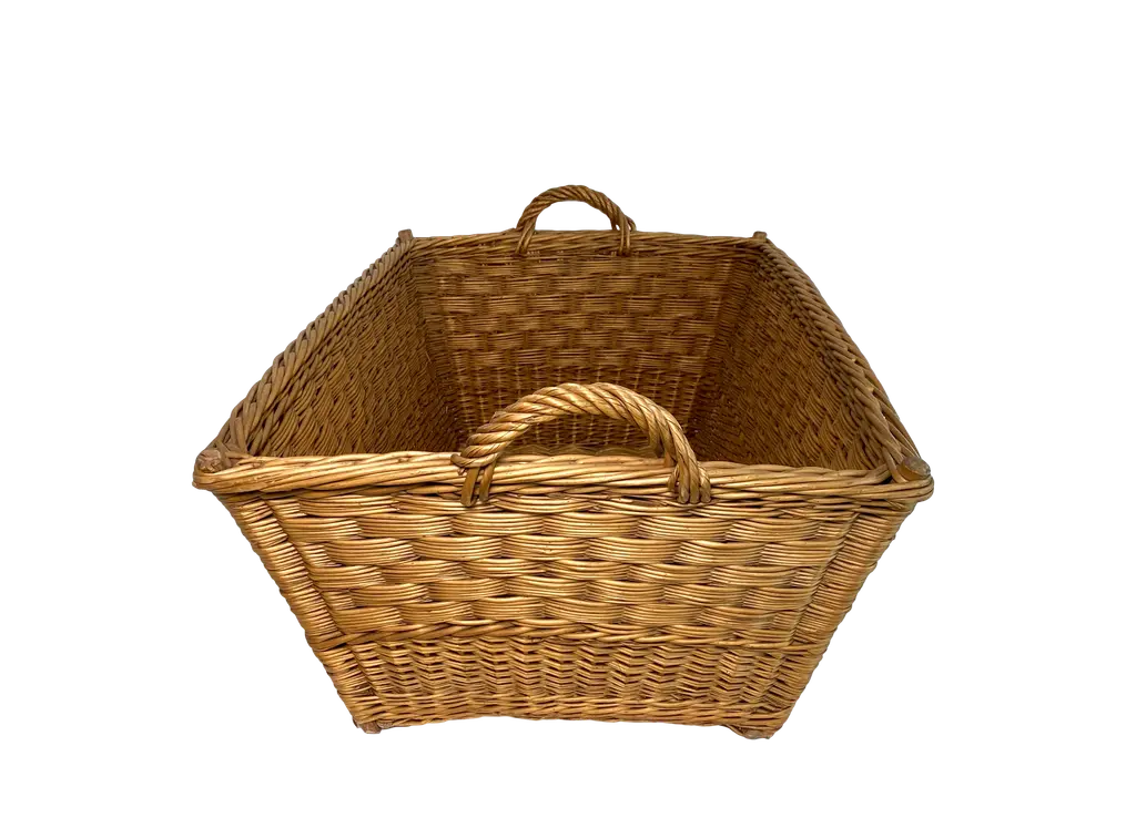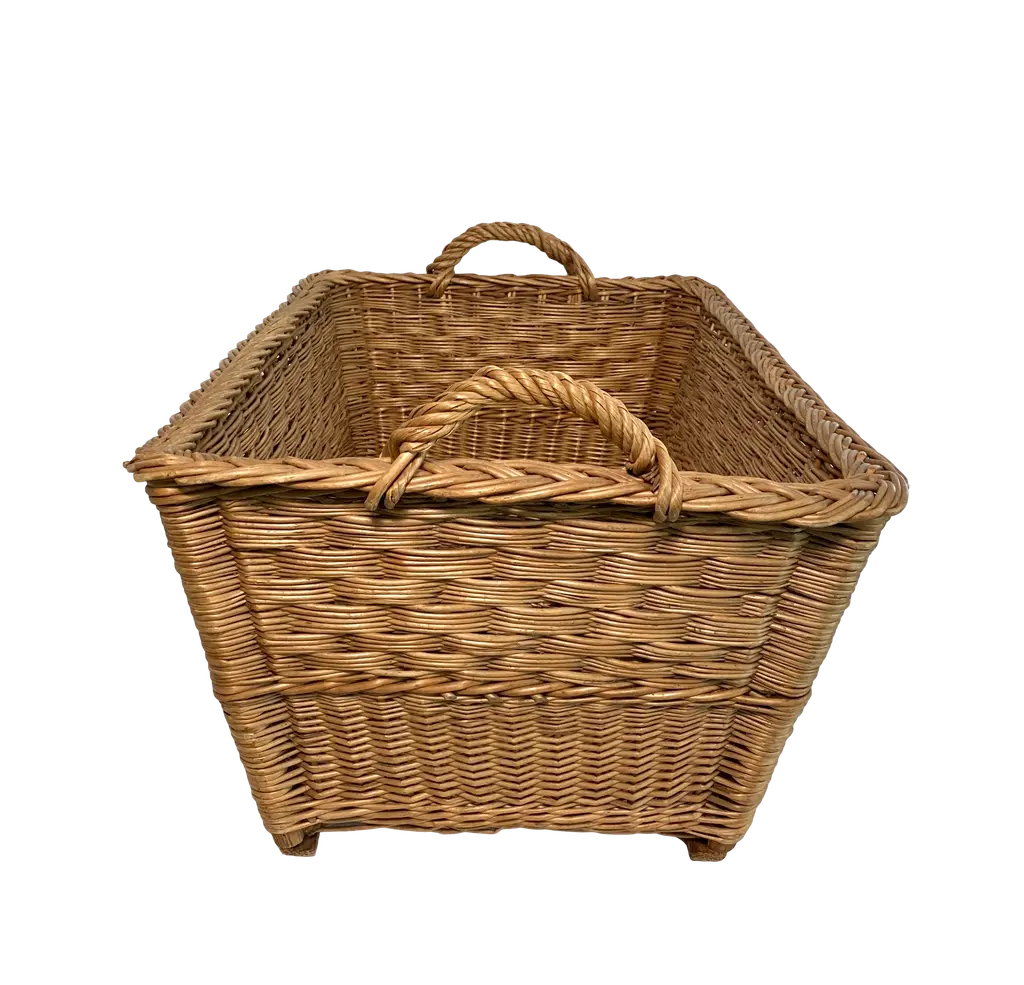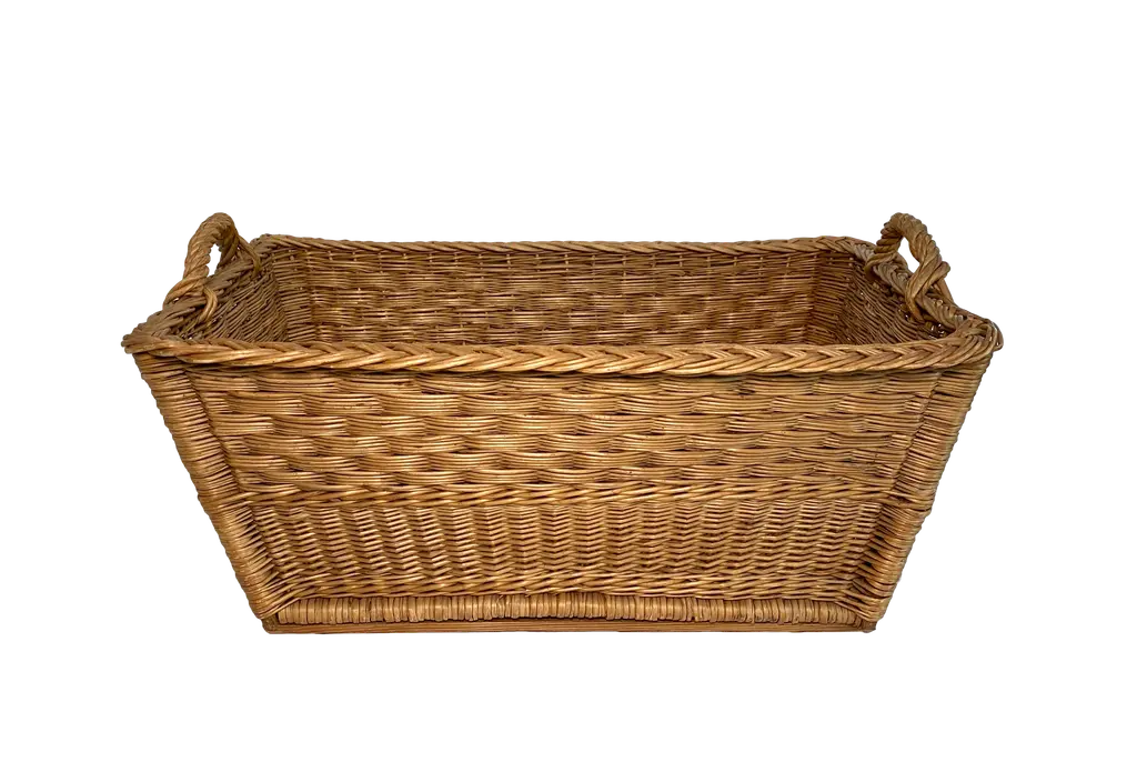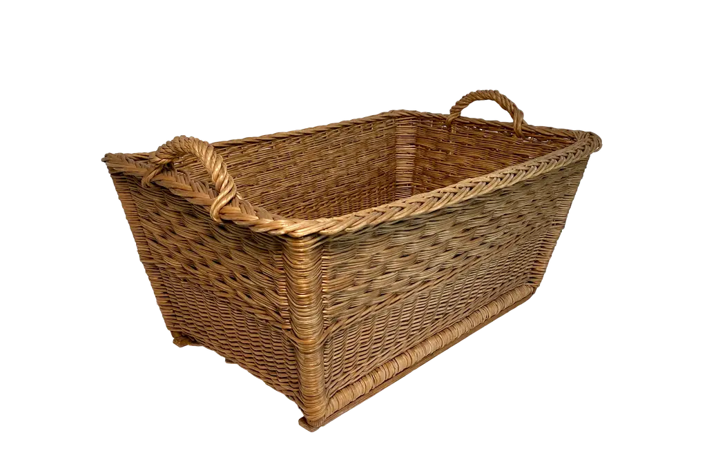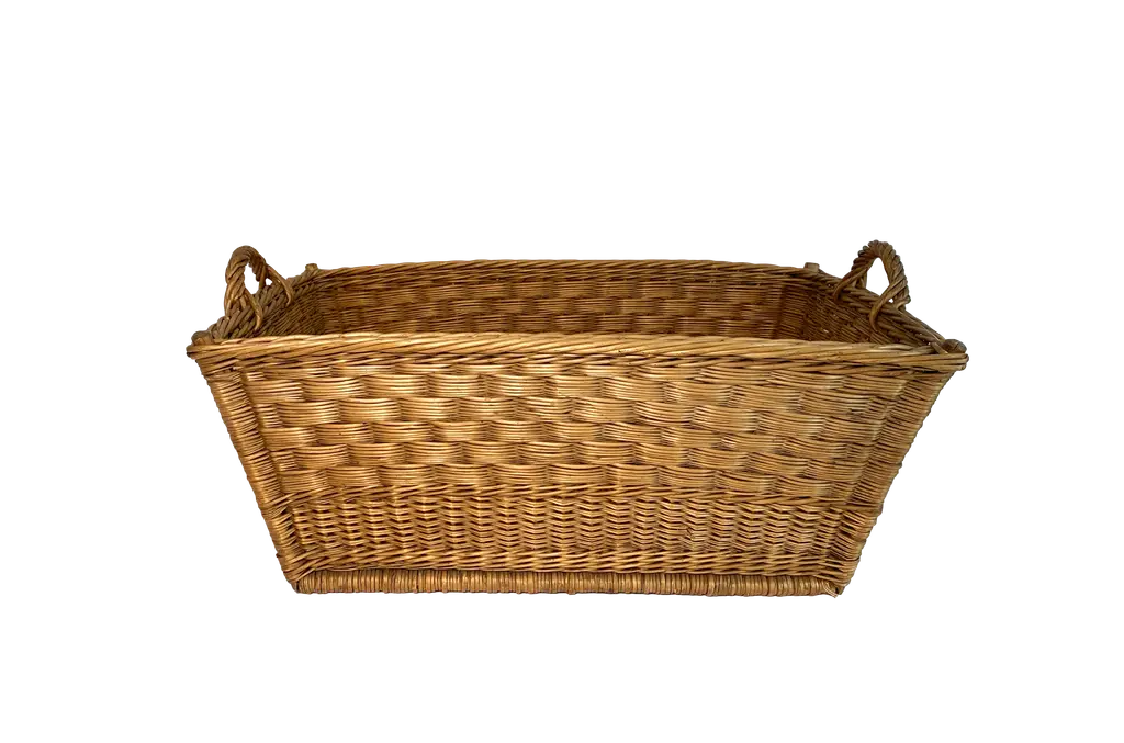 Extra large traditional 1960s woven wicker French market basket with handles and braided trim. Height of basket, 12.5". We pour through stacks of these baskets to find the best preserved pieces. There are a variety of sizes currently available in my inventory. Each has a different woven pattern.