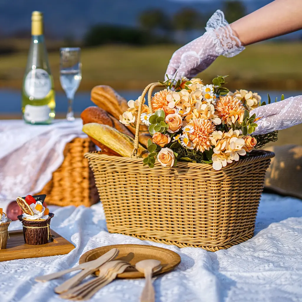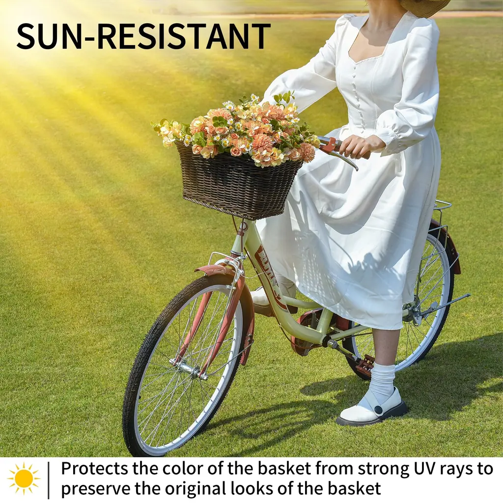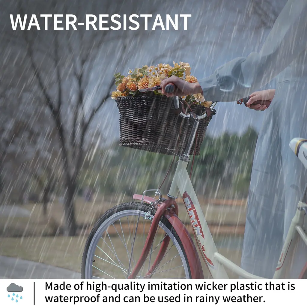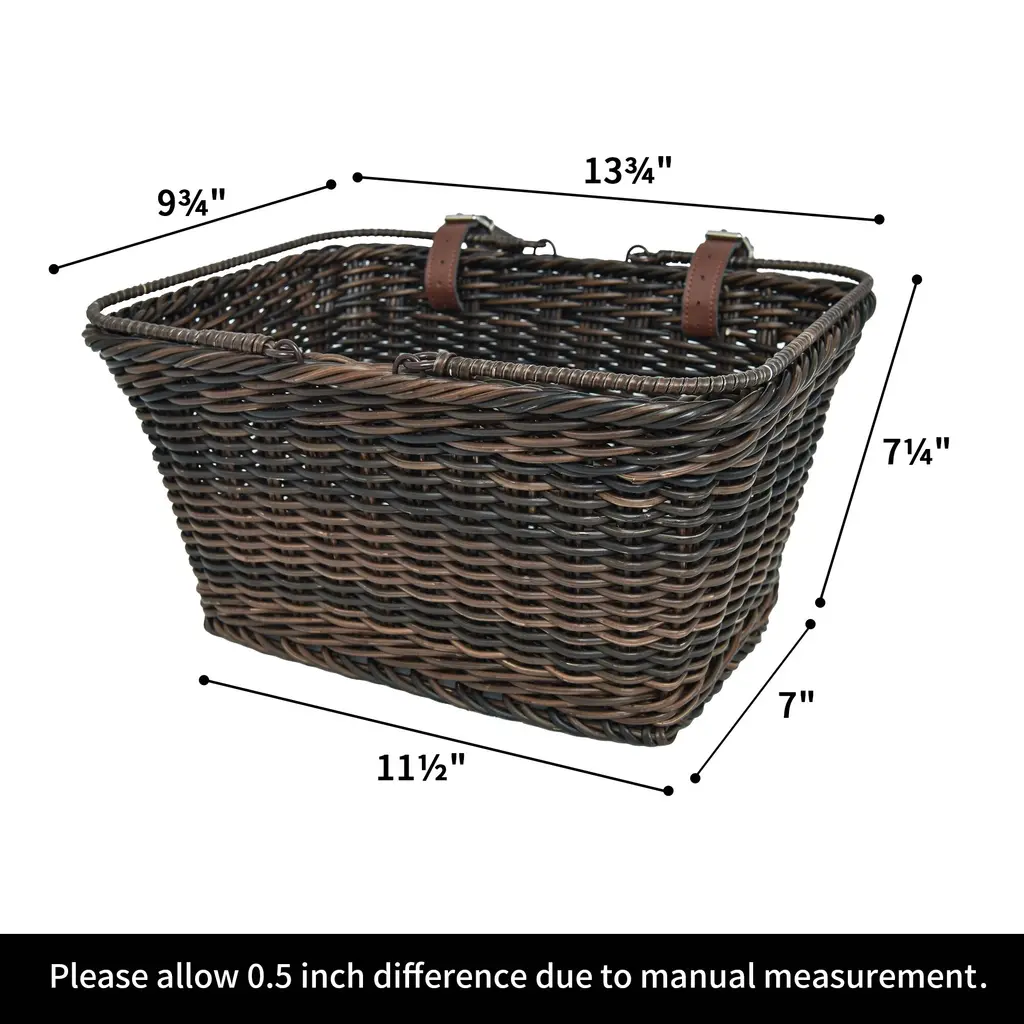 Take your cycling experience to the next level with this multifunctional bike basket, designed to hold all your essentials securely and stylishly. Made from high-fidelity plastic wicker, it's waterproof, weather-resistant, and fade-resistant, making it perfect for all outdoor adventures. The 2 sturdy handles make it easy to carry even when full, and the ample storage space, measuring 13 ¾"L x 9 ¾"W x 7 ¼"H, gives you plenty of room to store books, flowers, snacks, and more. Not only is this basket great for bikes, but it's also perfect as a gift basket, picnic basket, grocery shopping basket, commuter organizer, mobility scooter basket, walker basket, and even a pet carrier for small dogs!We Want to Hear From You!Shopping should be happy and satisfying! We want everything to be perfect for you. Should you have any problems with our products or tracking the order, please feel free to contact us through messages or email at cs@wellzone.life We have customer service standing by 24/7.