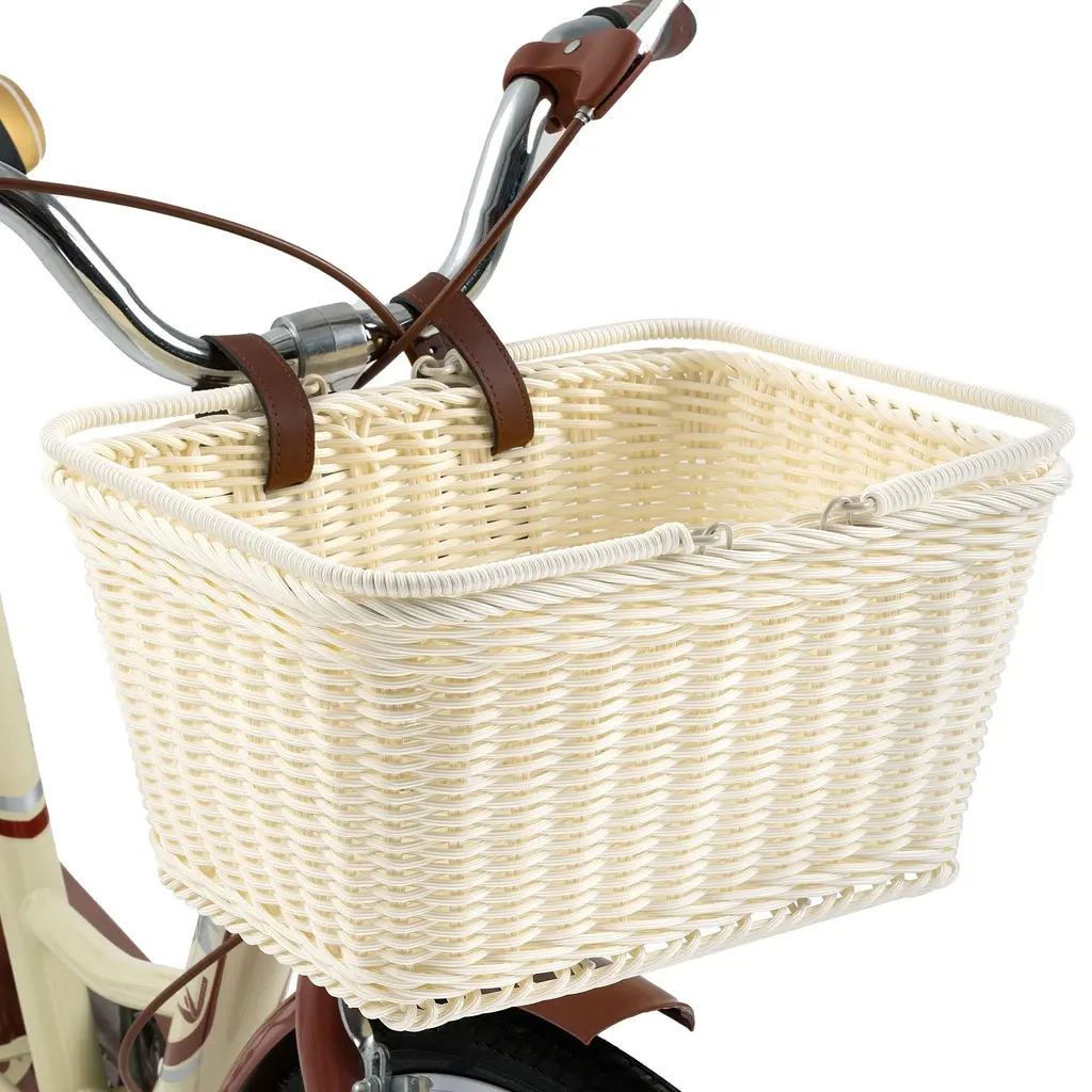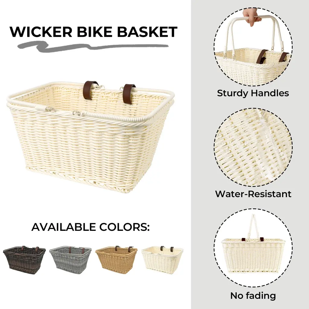 Take your cycling experience to the next level with this multifunctional bike basket, designed to hold all your essentials securely and stylishly. Made from high-fidelity plastic wicker, it's waterproof, weather-resistant, and fade-resistant, making it perfect for all outdoor adventures. The 2 sturdy handles make it easy to carry even when full, and the ample storage space, measuring 13 ¾"L x 9 ¾"W x 7 ¼"H, gives you plenty of room to store books, flowers, snacks, and more. Not only is this basket great for bikes, but it's also perfect as a gift basket, picnic basket, grocery shopping basket, commuter organizer, mobility scooter basket, walker basket, and even a pet carrier for small dogs!We Want to Hear From You!Shopping should be happy and satisfying! We want everything to be perfect for you. Should you have any problems with our products or tracking the order, please feel free to contact us through messages or email at cs@wellzone.life We have customer service standing by 24/7.