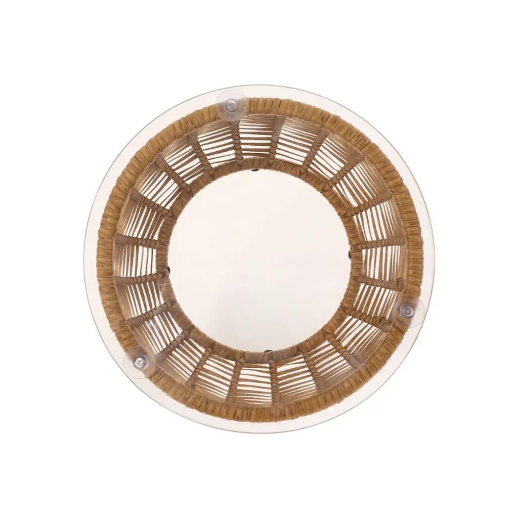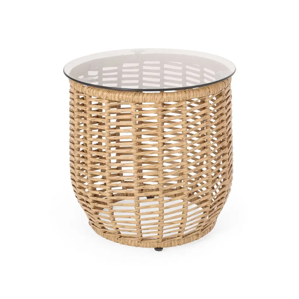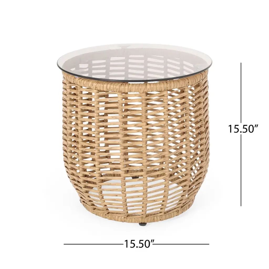 Add the perfect finishing touch to your outdoor seating area with this stylish and functional side table. Blending breezy boho charm with modern elegance, it features a sturdy metal frame wrapped in beautifully woven rattan for a look that’s both durable and decorative. Topped with a sleek tempered glass surface, this table is ideal for holding drinks, snacks, or your favorite reads as you soak up the sun in comfort and style. Material: Faux Rattan Frame Material: Iron Table Top Material: Tempered Glass Multiple Finish Options Assembly Required Dimensions: 15.50 inches deep x 15.50 inches wide x 15.50 inches high