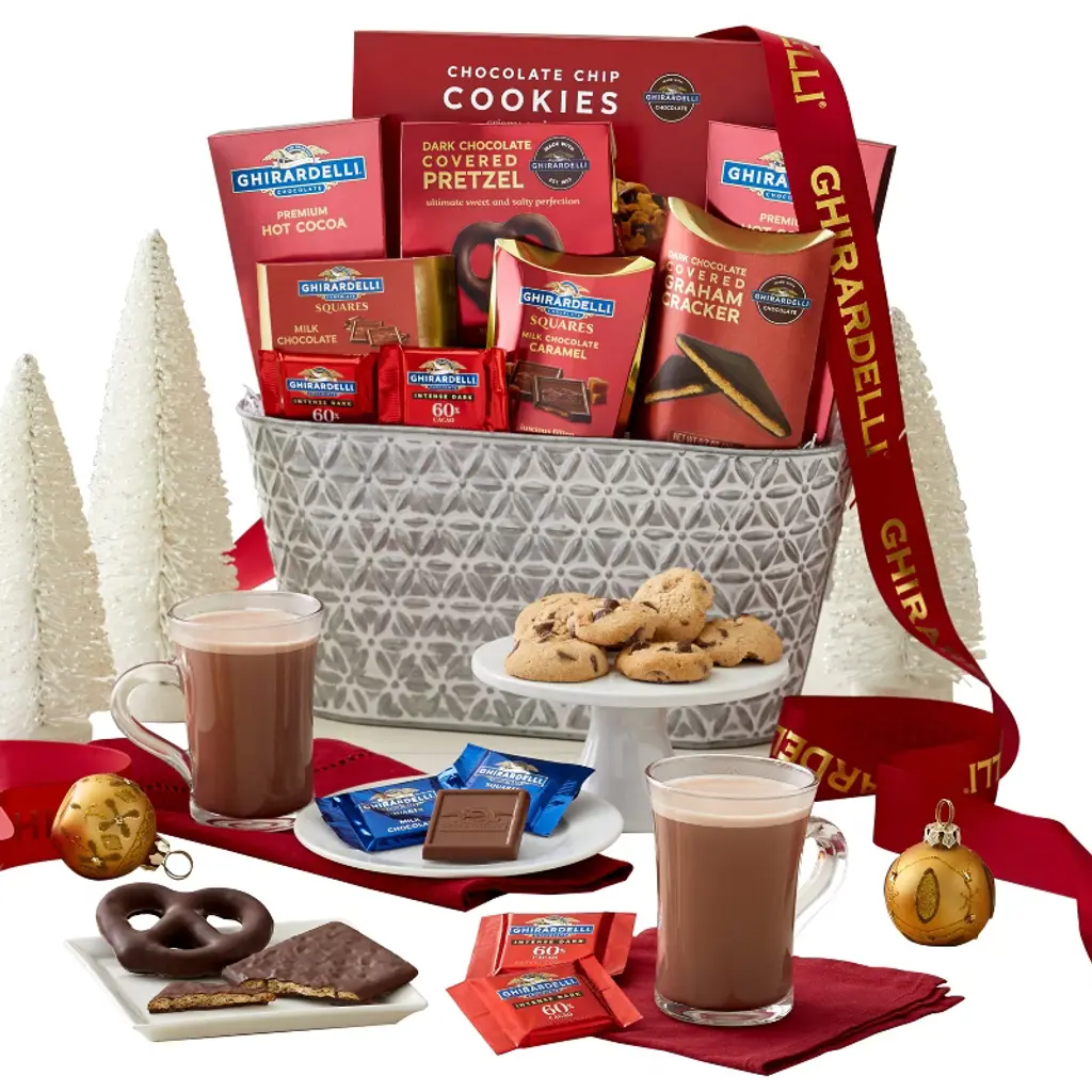 Share an abundant gift basket filled with some of Ghiardelli's best. Finished with a beautiful ribbon, each embossed silver metal basket is brimming with classics like rich chocolate chip cookies, smooth hot cocoa mix, and decadent chocolate squares. Choose from the Deluxe, Grande, and Supreme options for an increasingly indulgent chocolate assortment designed to impress.