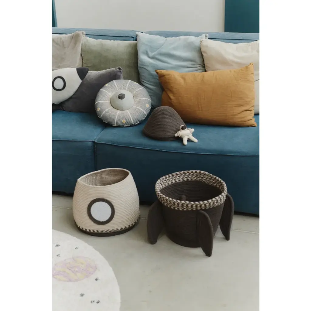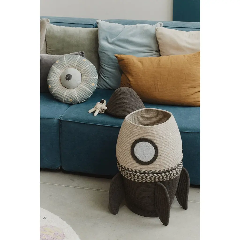 Get ready to blast off into outer space with our giant rocket basket! This versatile basket stack turns into a spaceship, made from durable recycled PET bottles in dark grey, natural, and light blue. Complete with a mini astronaut toy, this design is out-of-this-world in sustainability, style, + functionality. Buckle up and launch into cosmic adventures!