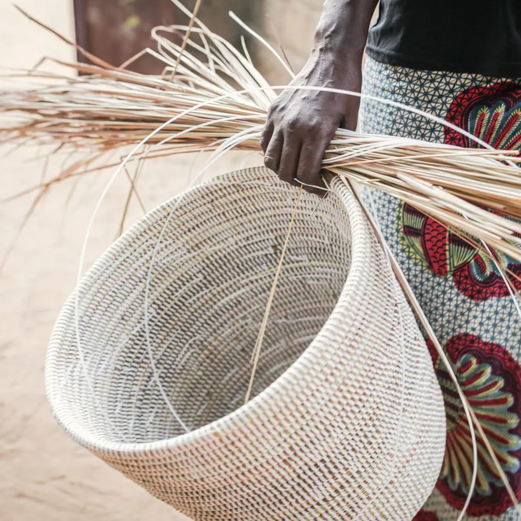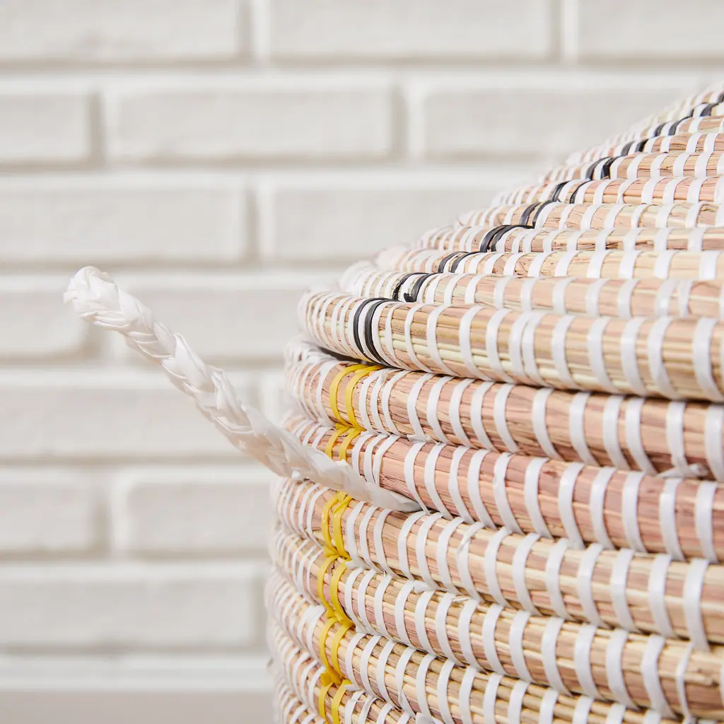 Craftswomen in rural Senegal use traditional techniques to handweave these Graphic Woven Baskets. Made from natural millet grass and recycled plastic threads. Use them for laundry, towels, toys or as entryway catchalls. Each basket is one-of-a-kind.