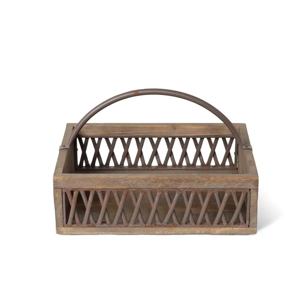Gray Wash Rectangle Tobacco Baskets with Metal Strips sell as a set of two vintage-style tobacco baskets that are made from woven strips of wood and galvanized metal. Each basket has lightly gray washed finish to the wood. These are perfect as a base for arrangements or storage, and they exemplify the modern farmhouse trend. Smaller basket measures 20" wide by 12.75" deep and 3" high. Larger basket measures 24" wide by 15.5" deep and 4.25" high.