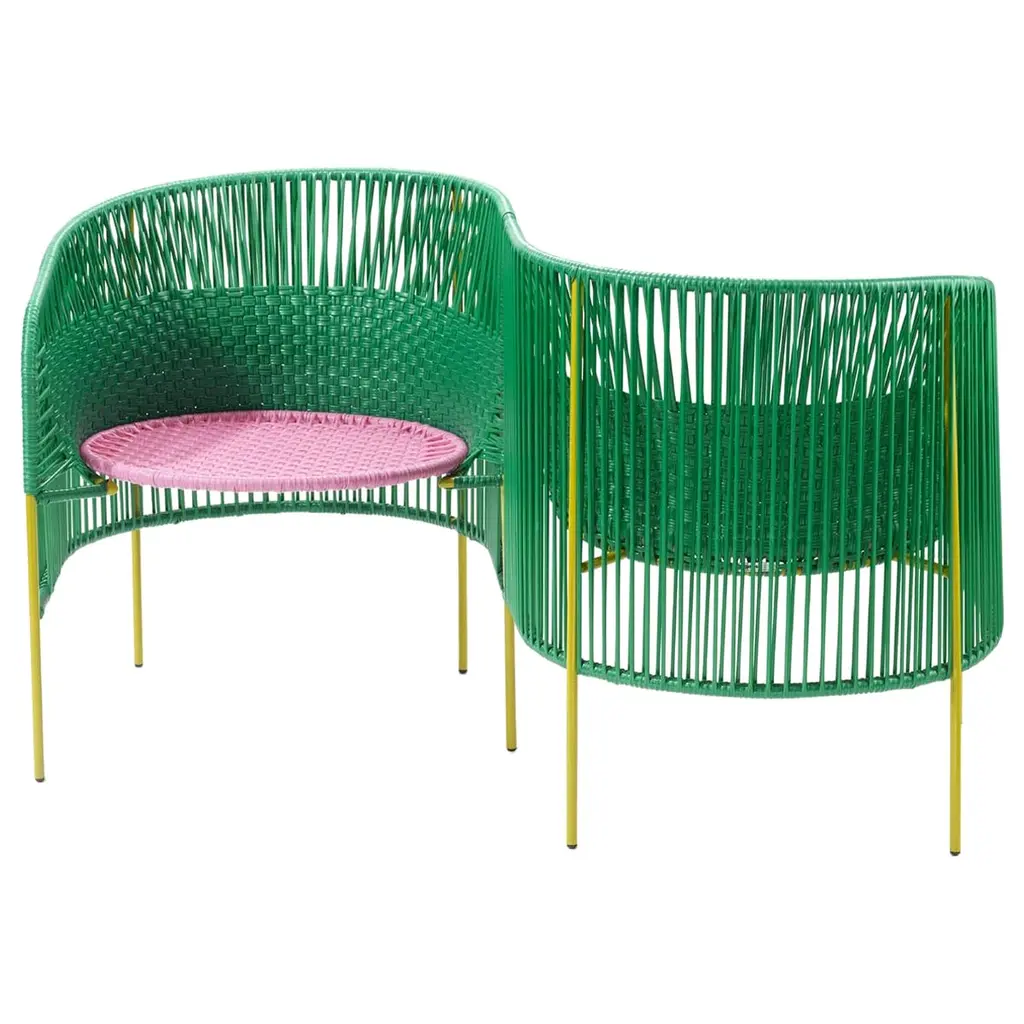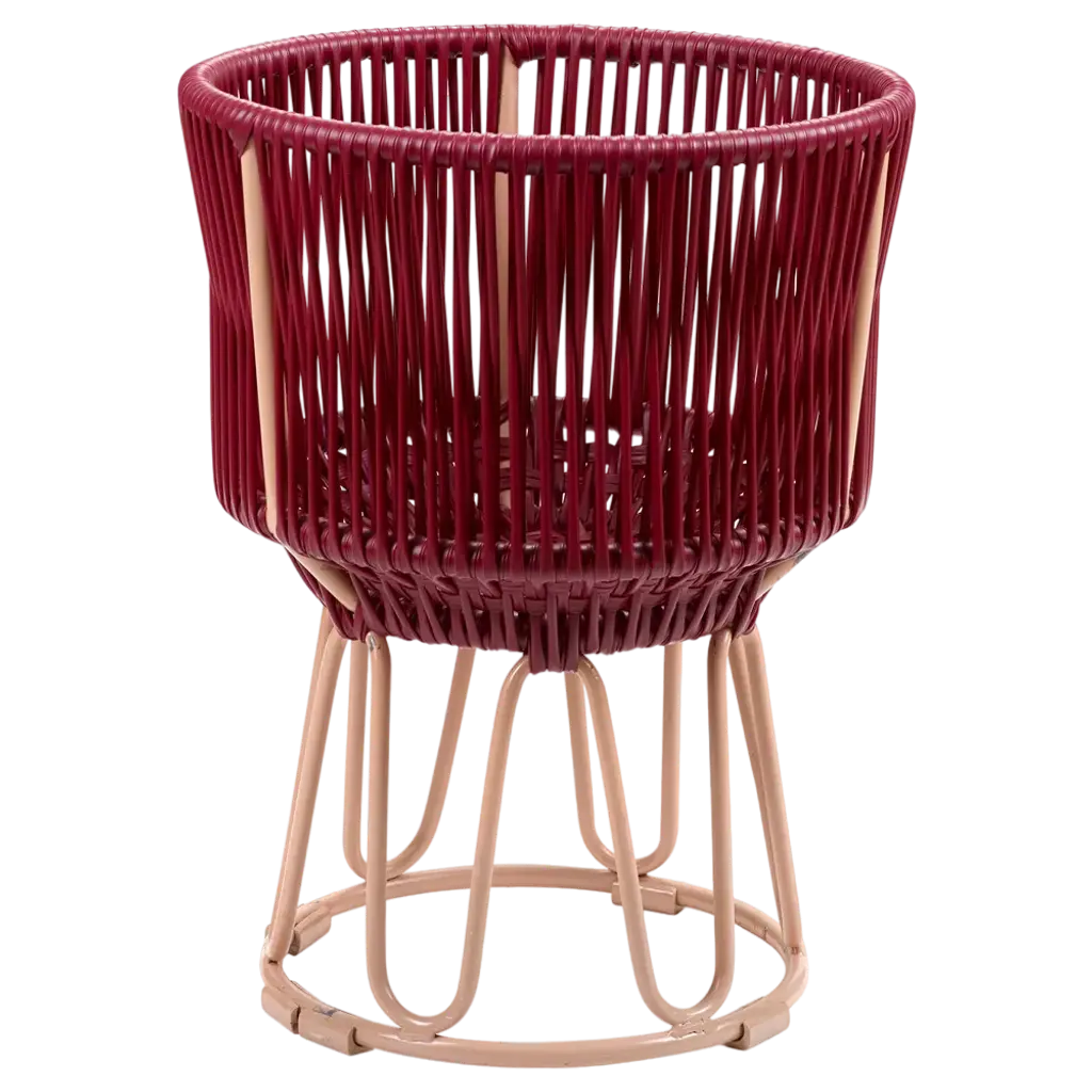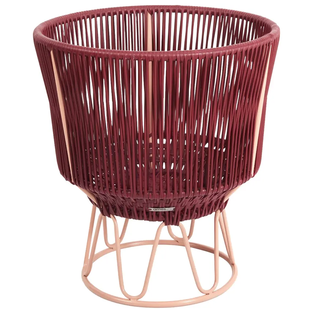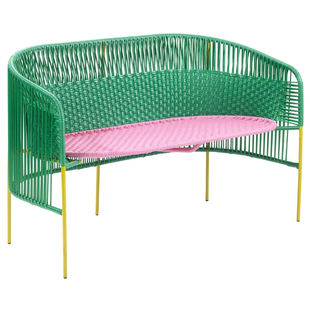 Green caribe basket table by Sebastian Herkner.Materials: Galvanized and powder-coated tubular steel. PVC strings are made from recycled plastic.Technique: Made from recycled plastic and weaved by local craftspeople in Colombia. Dimensions: diameter 54.1 x height 41 cm Also available colors: blue/ mint/ black, mint/ green/ black, orange/ rose/ curry, green/ rose/ curry. The charming Caribe Basket Table is a colorful companion for seating arrangements inside and outdoors. It’s part of the Caribe collection, designed by Sebastian Herkner for ames. The German designer visited Colombia together with Ames founder Ana Maria Calderon-Kayser and translated the vibrancy and spirit of the country’s people and traditions into joyful, modern furniture pieces defined by clean lines, strong colors, and the hand-woven webbing.Each basket is made in Santa Marta, a city on the Caribbean coast of Colombia, by local craftspeople. They weave the PVC strings, which are made from recycled plastic, around the tubular steel frame. The weaving technique the artesanos and artesanas use are called Momposino, a traditional method known for intricate patterns. Just the preparation of all the materials takes ten days, while the production of each table takes two daysGerman designer Sebastian Herkner is a long-term collaborator of Ames and has visited Colombia multiple times to experience the country’s cities, nature and people first hand. He also visited many of the ateliers that Ames has partnered with to learn about the unique traditional crafts of Colombia's regions. A sought-after contemporary designer and recipient of many industry awards, he has worked with many international design brands, creating intriguing pieces that showcase his intuition for interesting material, color, and texture combinations.