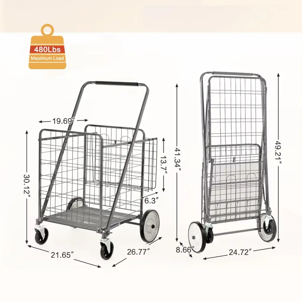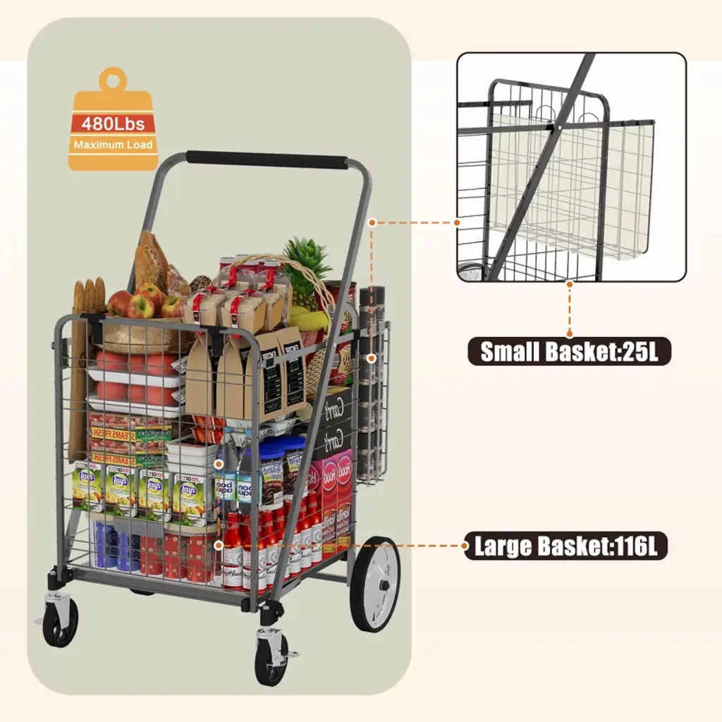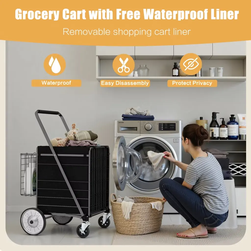 This super jumbo foldable shopping cart is perfect for groceries, laundry, and more. It has double baskets for ample storage¡ªone large front basket and a rear one for small items like eggs or wallets. With 360¡ã swivel front wheels and durable rear wheels, it moves easily on sidewalks or uneven surfaces. It also comes with a waterproof liner and a strong structure to handle heavy loads, plus it¡¯s foldable for convenient storage.?