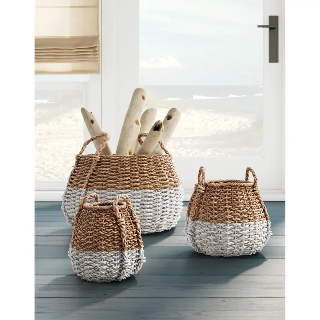 This set of 3 storage baskets helps you welcome in a touch of coastal charm while tidying up everything from magazines in the living room to toys in the playroom. Each double-walled basket is woven from seagrass in a natural brown color, and has a painted white bottom for contrast. Plus, each basket has two handles that makes it easy to pick up and move from room to room, especially for your little ones. The largest basket measures 16.5'' W, and the smallest, 8.25" W, so there's a size for almost every need.