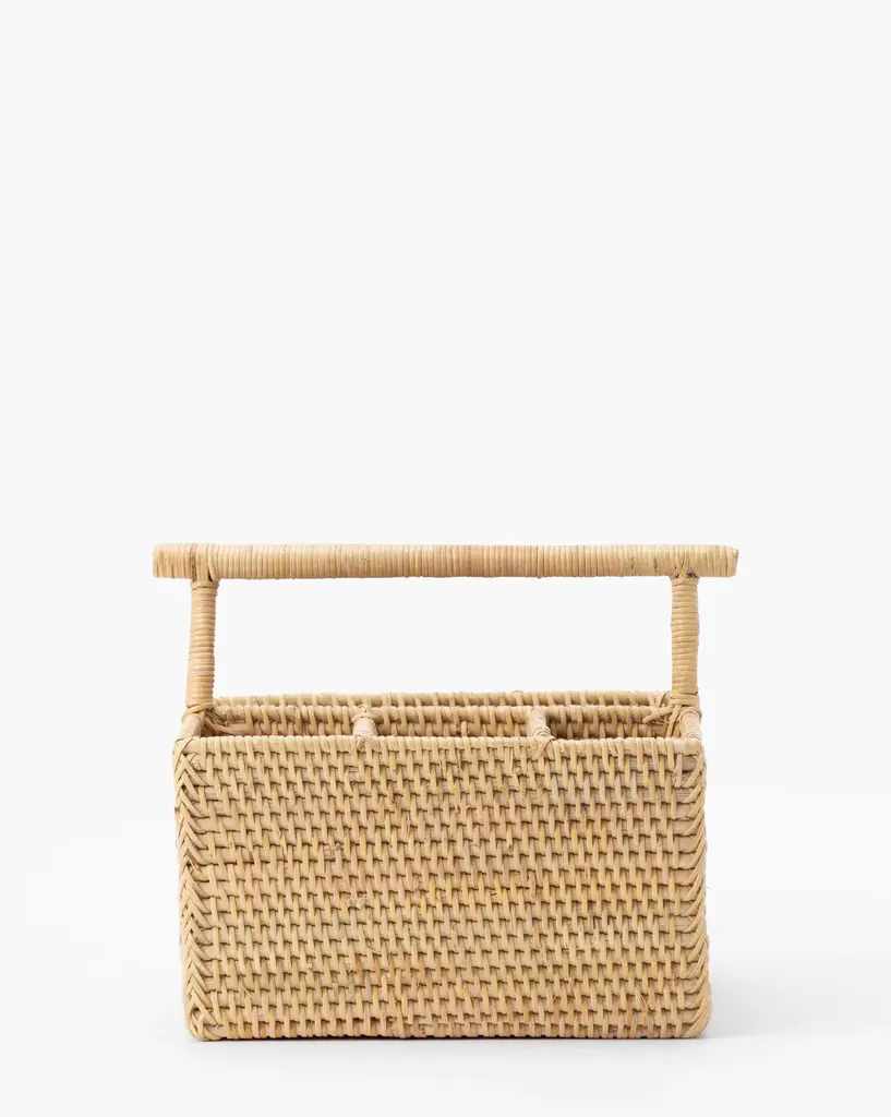 Intricately woven in poly-rattan, the Handled Planter Basket has a clever box design with rounded edges. Lined with a plastic insert, this piece is ready to handle small indoor plants or stand alone as a textural addition to home decor.