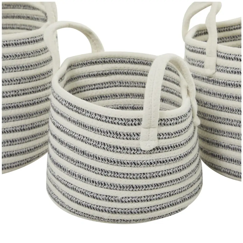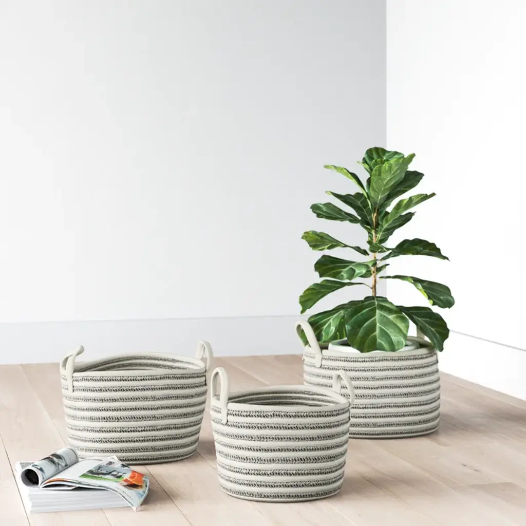 Keep your space tidy and neat with the help of these storage baskets. Filled with shoes, books, blankets and more, these storage baskets are a stylish way to store your stuff. Easily arrange this set of 3 coastal baskets beside your sofa as a chic storage for blankets and throws for a more organized home. This item ships in 1 carton. Due to the handmade nature of these baskets, there will be slight color, shape, and size variations, as well as loose fibers.. Suitable for indoor use only. Storage baskets come as a set of 3. Coastal style.