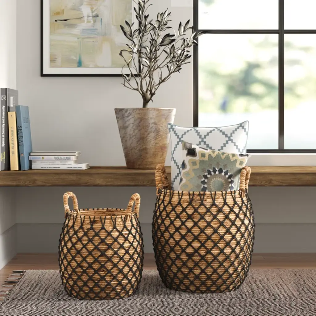 This 2-piece set of wicker baskets lets you organize and declutter your space in streamlined style. Each piece is made from woven banana leaves with black macrame accents delicately interwoven with neutral brown natural fibers. We love the contrast of the dark and the light, plus the interplay of different directions and weaves. For added convenience, each basket has two handles, so they're easy to relocate to wherever you need them most. Plus, they come with a liner, so you can use them for laundry, spare blankets and pillows, and so much more.