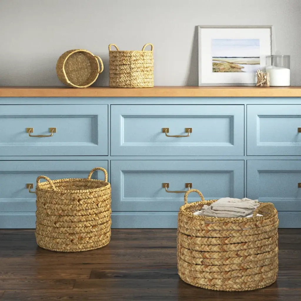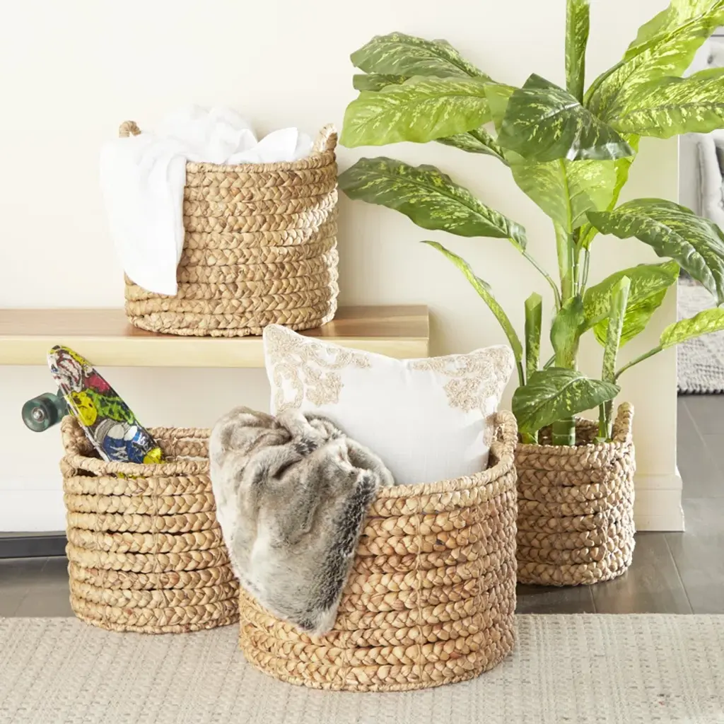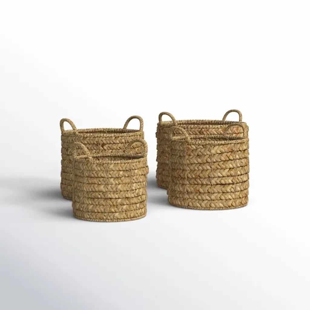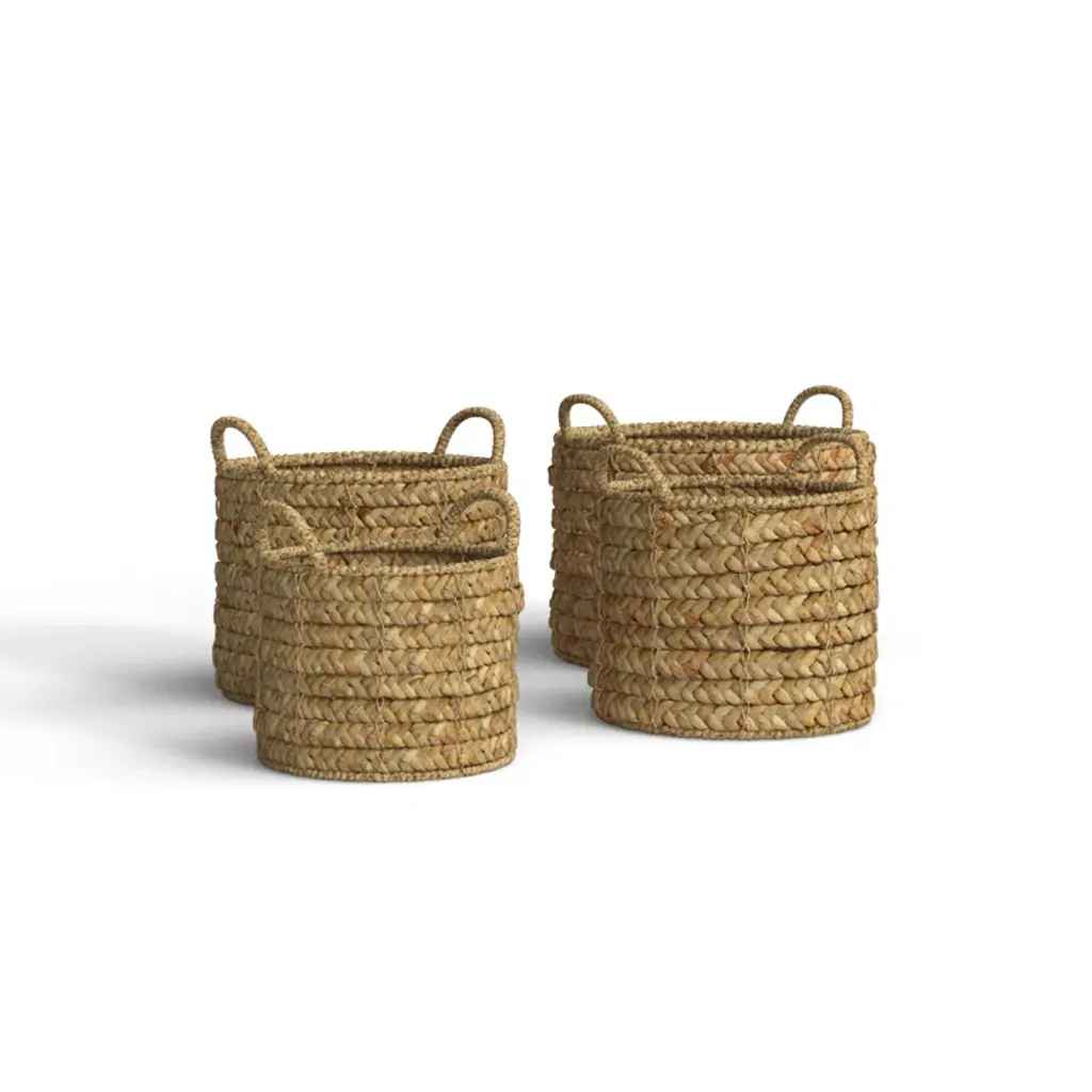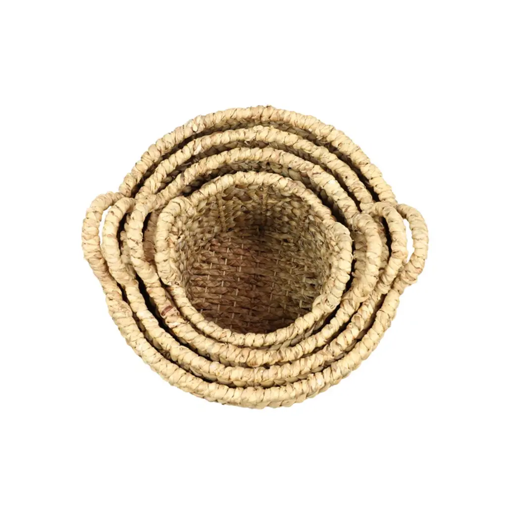 Embrace natural beauty and practicality with this set of four round seagrass baskets. Handwoven from water hyacinth, these baskets feature a warm beige hue and horizontal rows of braided wicker rope cords, bound by rattan strips. Their graduated sizes and two-inch tall half-circle handles make them versatile for storage and easy to carry. Ideal for linens, blankets, or even toys, these baskets bring a touch of earthy elegance to your home while keeping it organized. Plus, they're stackable, so you can save space when not in use.