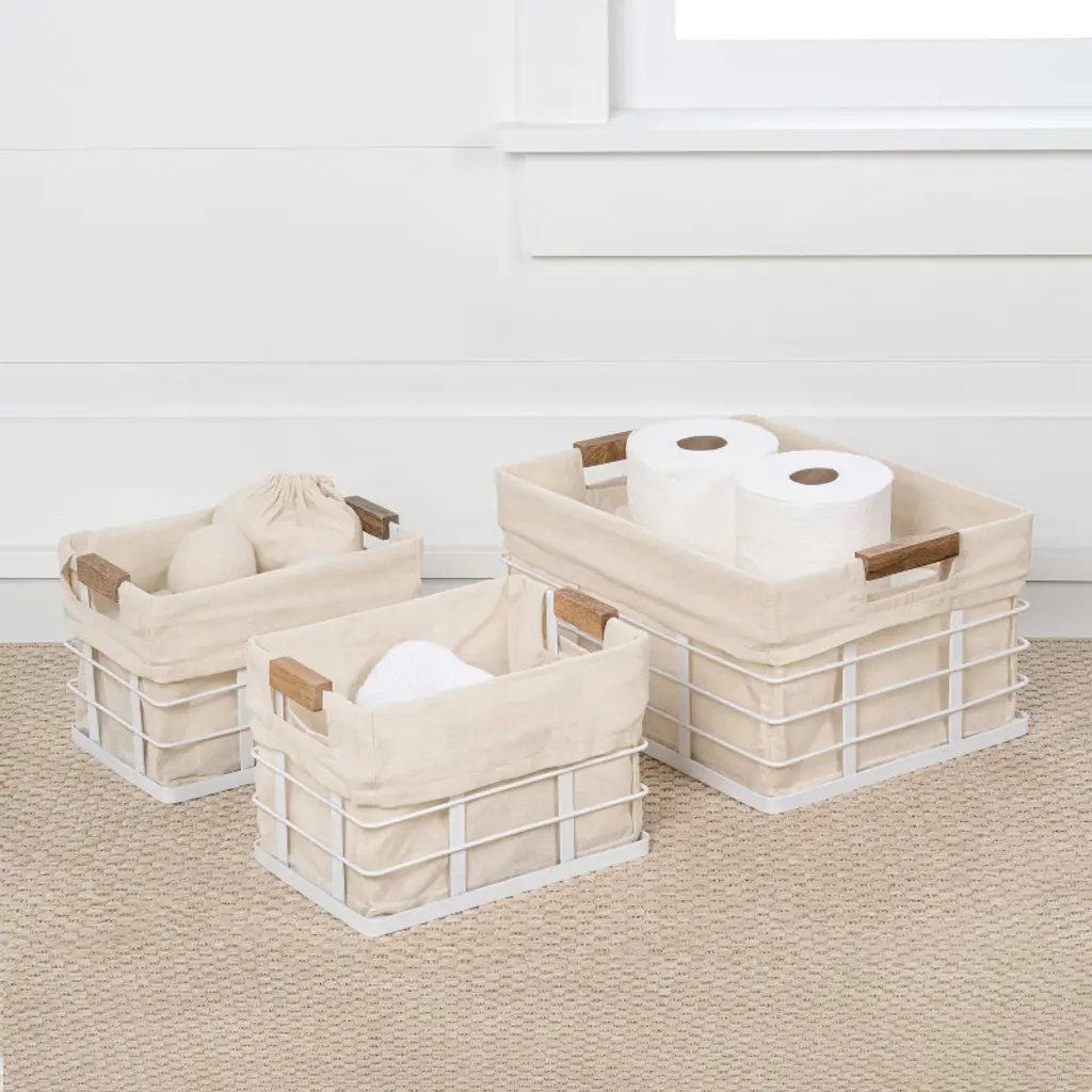Give a home office, bathroom or kitchen shelves a storage makeover with vintage style metal baskets. Set includes three baskets that fit perfectly in a cabinet or on open shelving. Durable design features metal wires and wooden handles for an industrial accent; fabric liner keeps small items in