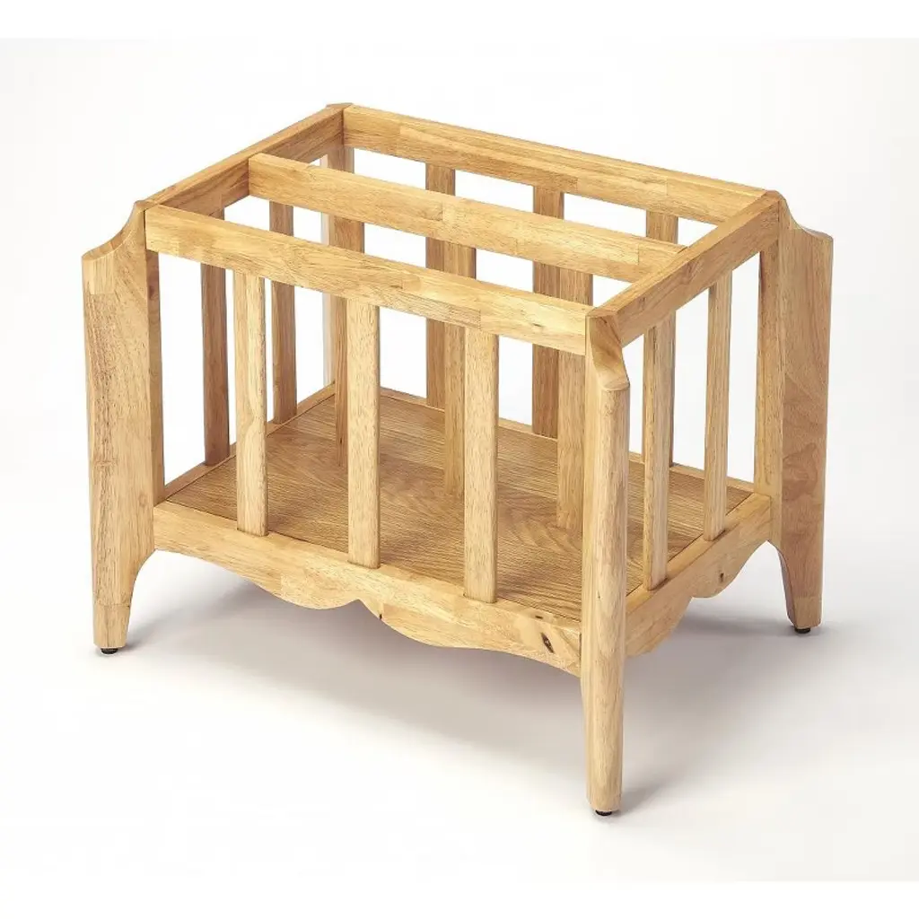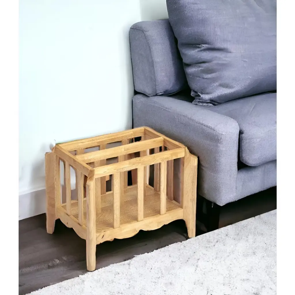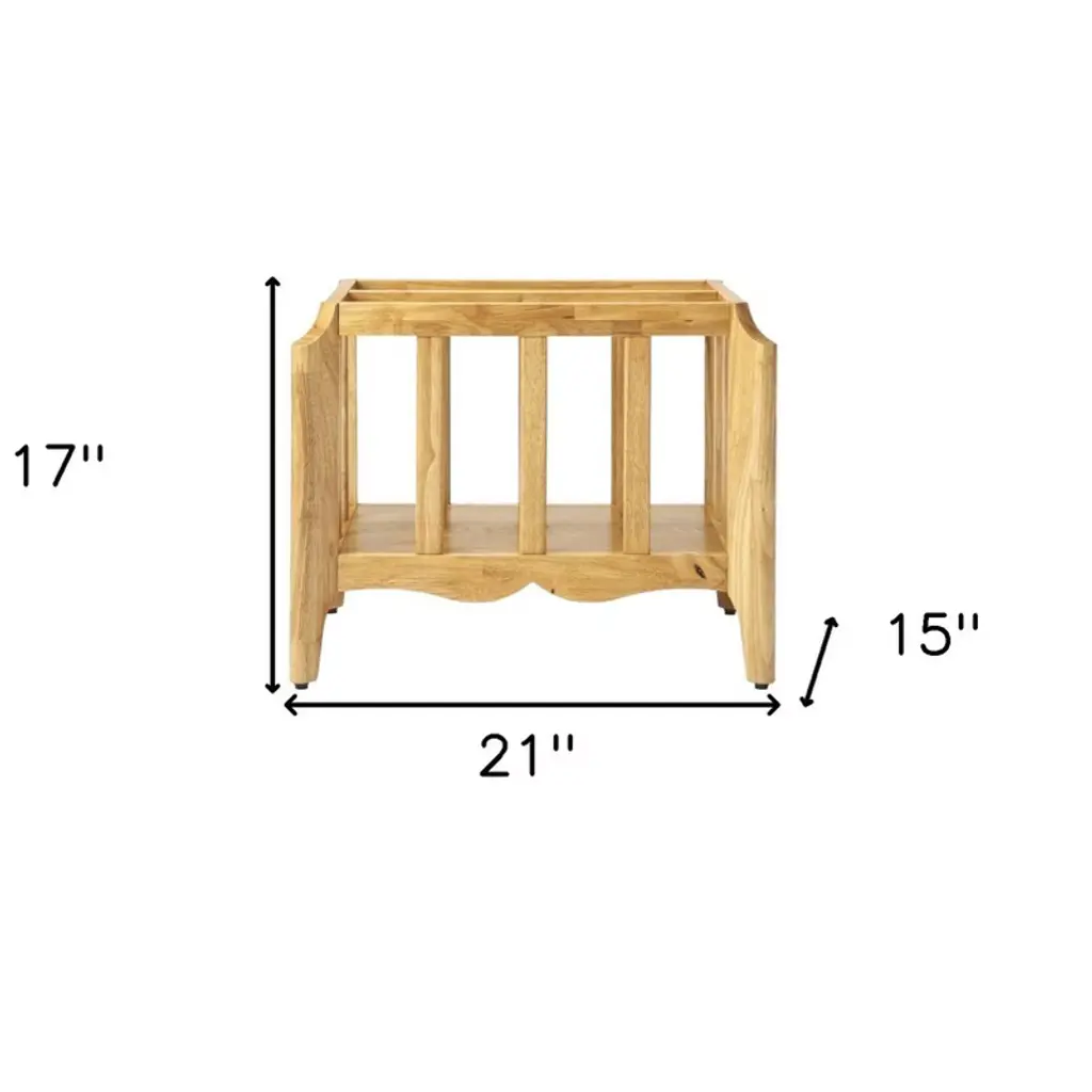Crafted from wood solids and oak veneers, the Natural woo magazine basket is a beautiful combination of color, form and function. The easily accessible design permits for trouble-free storage. Slatted panels and scalloped edge form the framework of this chocolate brown basket. A middle divider panel enhances the storage capacity of the basket while an open framework enables you to shift it from room to room. 17-inch H x 21-inch W x 15-inch D