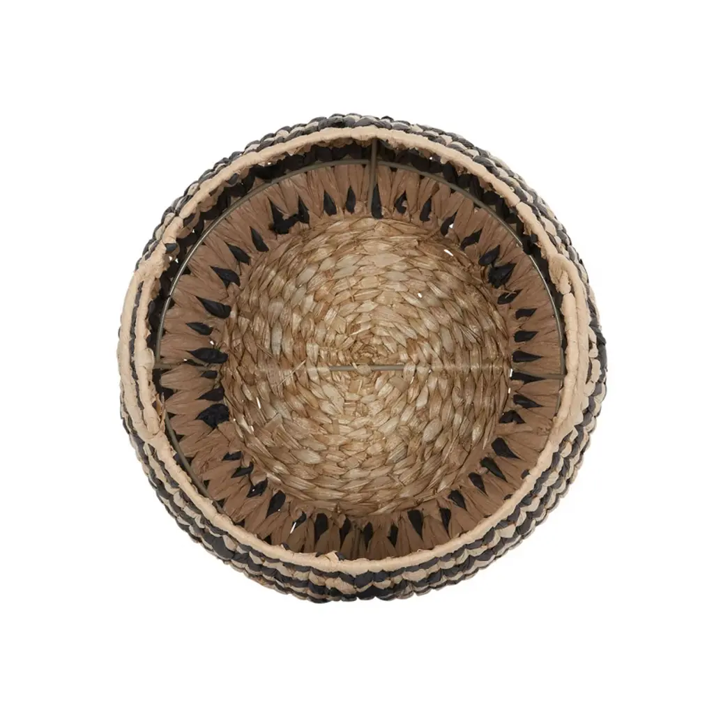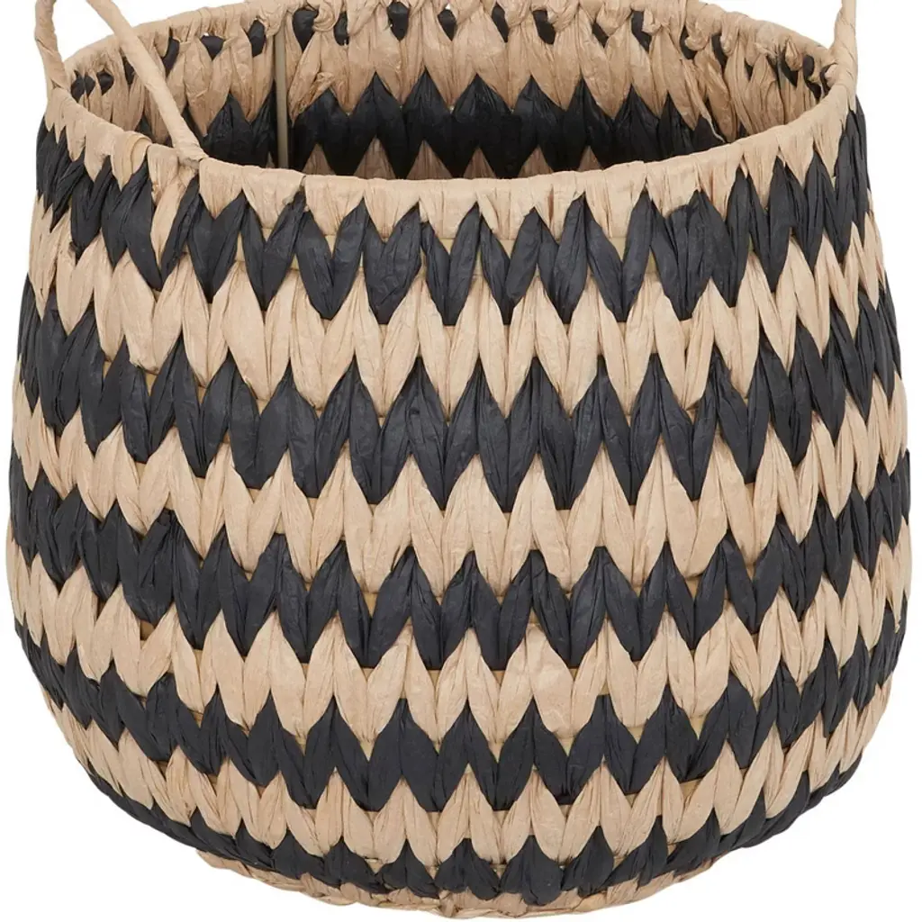 This set of two decorative woven baskets allows you to easily add smart storage and an attractive visual element to any room in your home. Each basket is made of natural handwoven cattail and paper fibers with metal wire frames for stability and handles for easy carrying. The natural cattail and paper fibers are soft but durable and give the basket that trendy yet classic natural look. Each basket has a slightly rounded shape, adding to the natural look and feel. Each basket is woven with a black patterned design, elevating its natural look to something more modern and chic. These baskets have a variety of potential applications in your home. Use them to store loose items in any room or closet, as decorative planter exteriors and more. With a set of two woven baskets, you could use one for storage and the other one just for decoration, use them both for decoration or use them both for storage. No matter how you use these baskets, they’re sure to add smart, timeless style and function to your home.