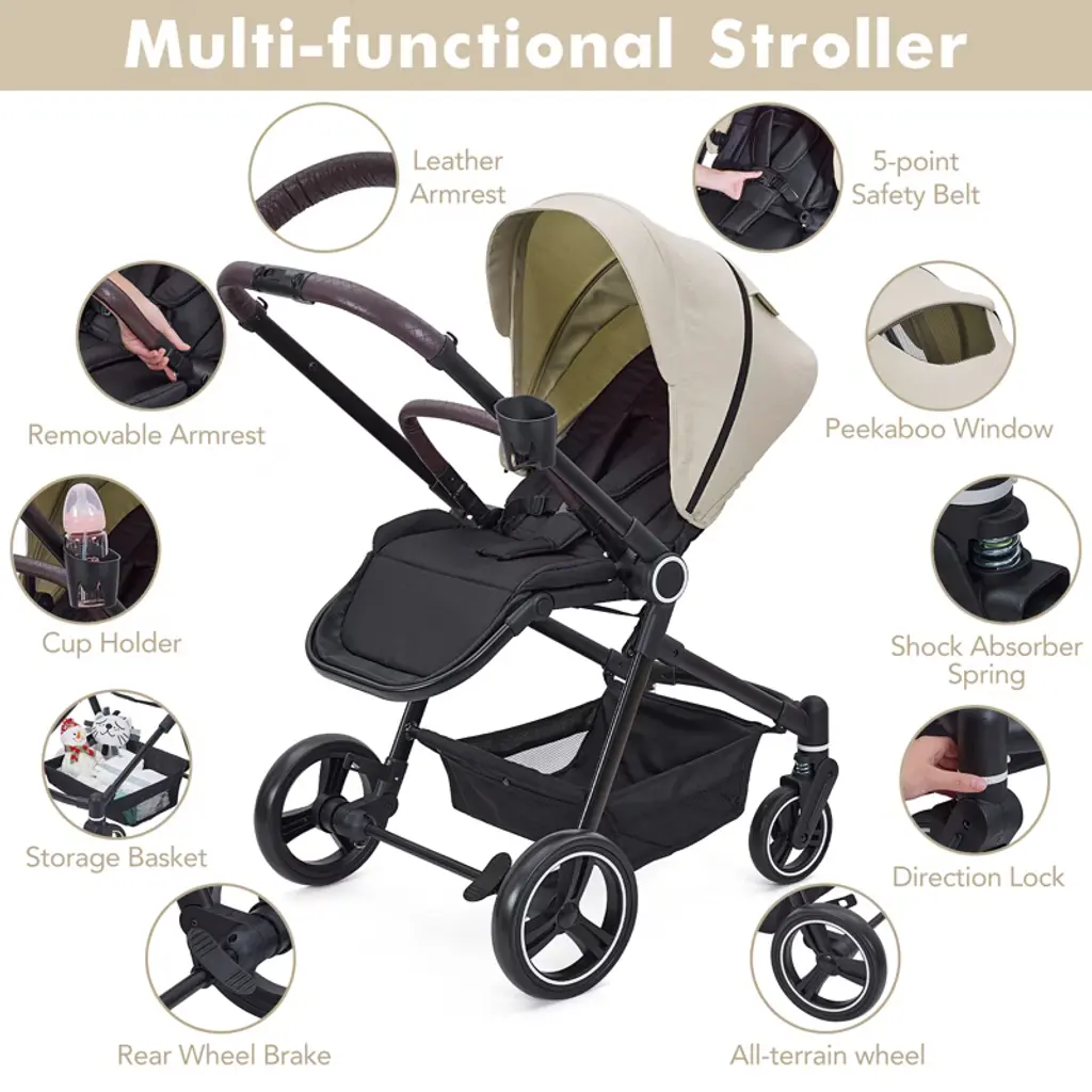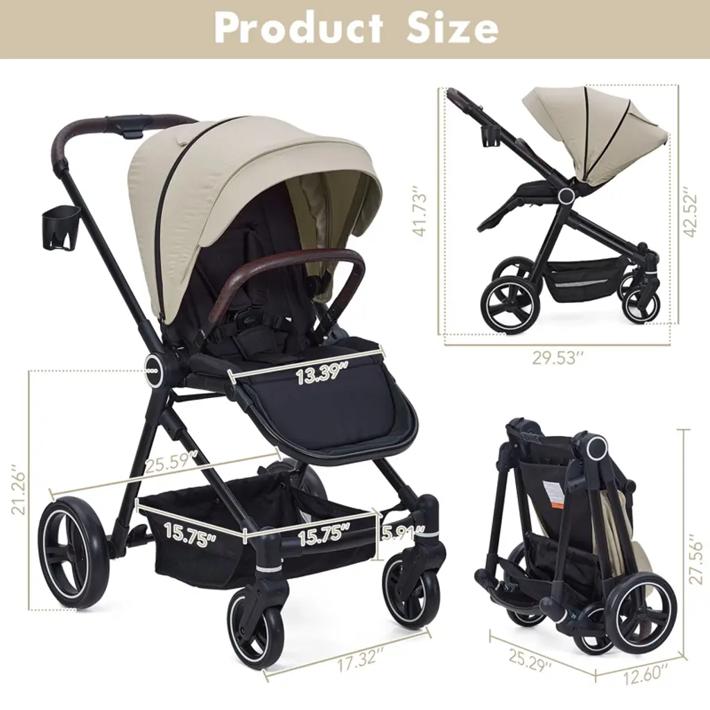 This versatile and stylish stroller combines safety, comfort, and convenience, making it the perfect choice for families on the move. From city sidewalks to country trails, our stroller is built to handle every adventure with ease!Feature:Adaptable Design for Every Stage: The infant stroller is thoughtfully designed to grow with your child. Featuring a reclining seat supports your baby from infancy through toddlerhood, suitable for 2 months to 36 months baby.Smooth Maneuverability: With high-quality, all-terrain wheels and front-wheel suspension, this stroller glides smoothly over various surfaces.Ample Storage Space: This toddler stroller features a generous storage basket beneath the seat, perfect for diaper bags, shopping, toys, and more.Adjustable Canopy: The compact stroller includes an adjustable canopy providing shade for your child, ensuring optimal sun protection during outings.Specification:Color: Cream ColorMaterial: Aluminum Frame/Cationic ClothExpanded Size: 25.59''×29.53''×41.73''Foldable Size: 25.29''×12.6''×27.56''Storage Basket Size: 15.75''×15.75''×5.91''Seat Height: 21.26''Canopy Height: 42.52'' Armrest Height: 41.73''Front Wheel Distance: 17.32''Rear Wheel Distance: 25.59''Packing List: 1×baby stroller1×Storage Basket1×Cup Holder1×InstructionNote:Before making a purchase, please consider your child's weight and age to ensure that our baby stroller meets your specific needs. Before use, it's important to check that the safety belt of the stroller is securely fastened and that the braking system operates smoothly and effectively.