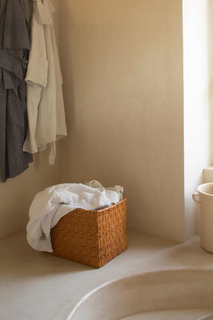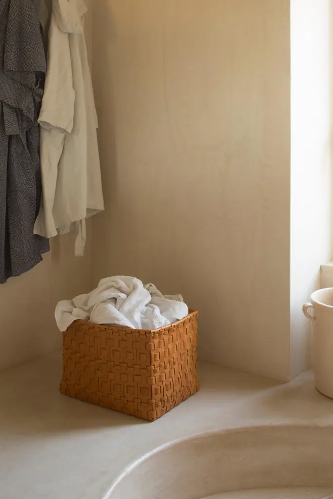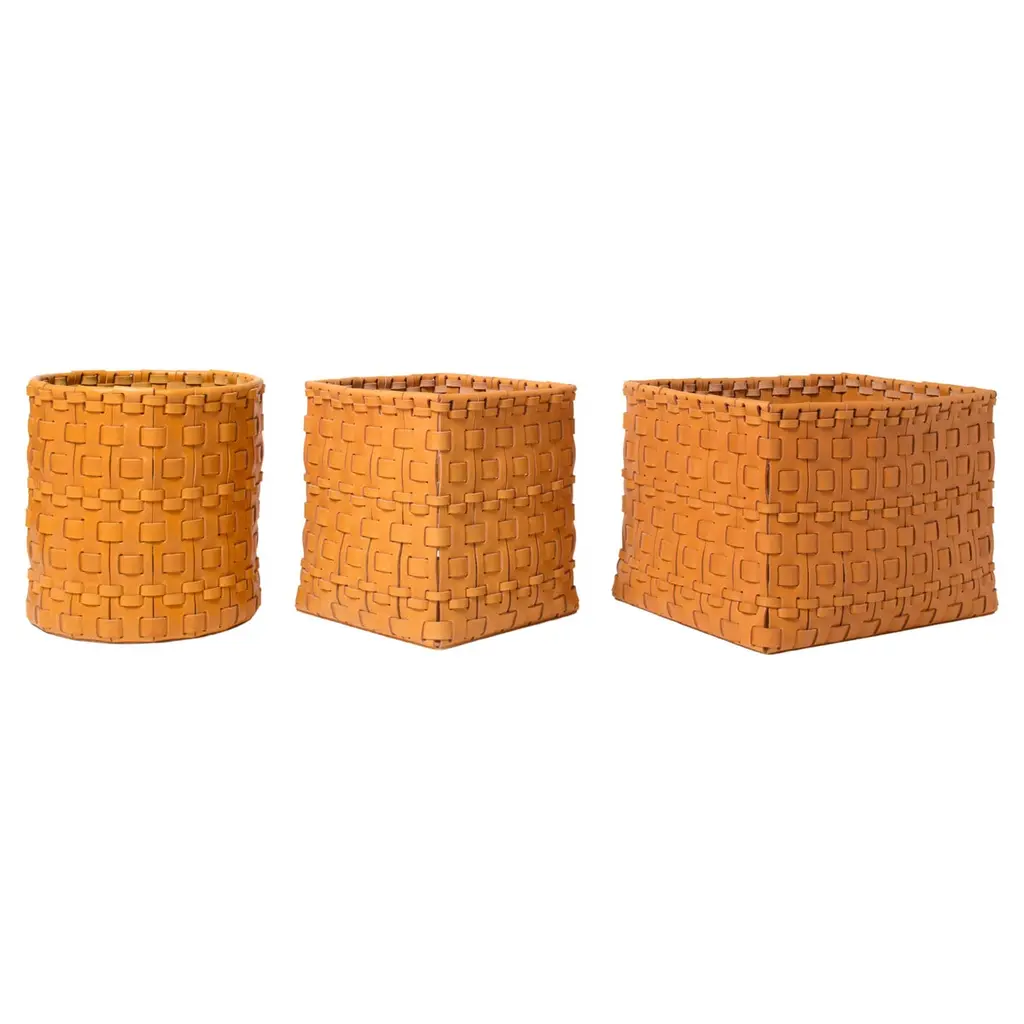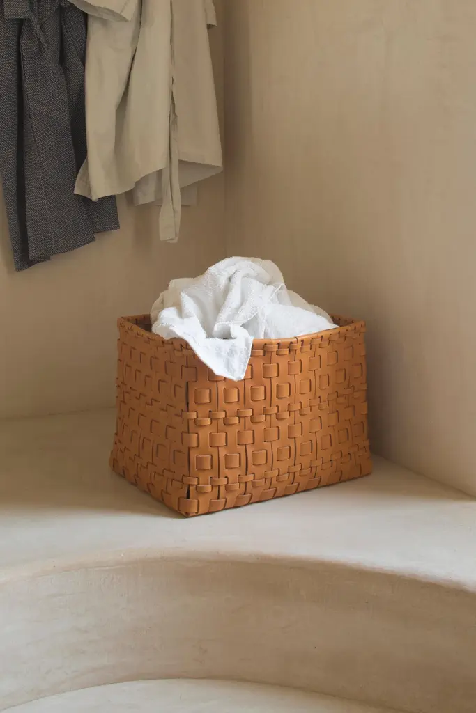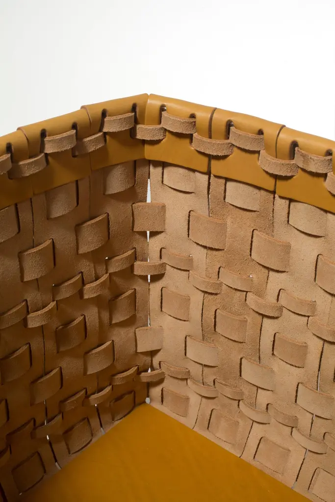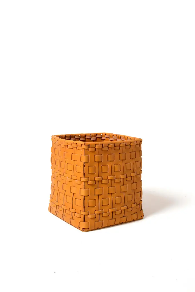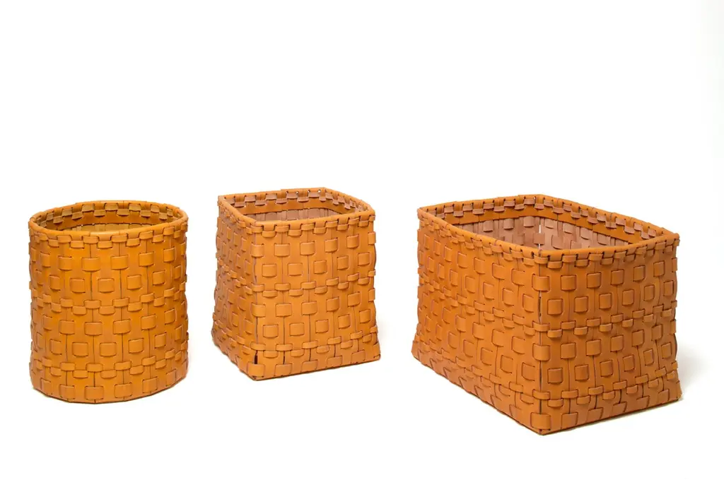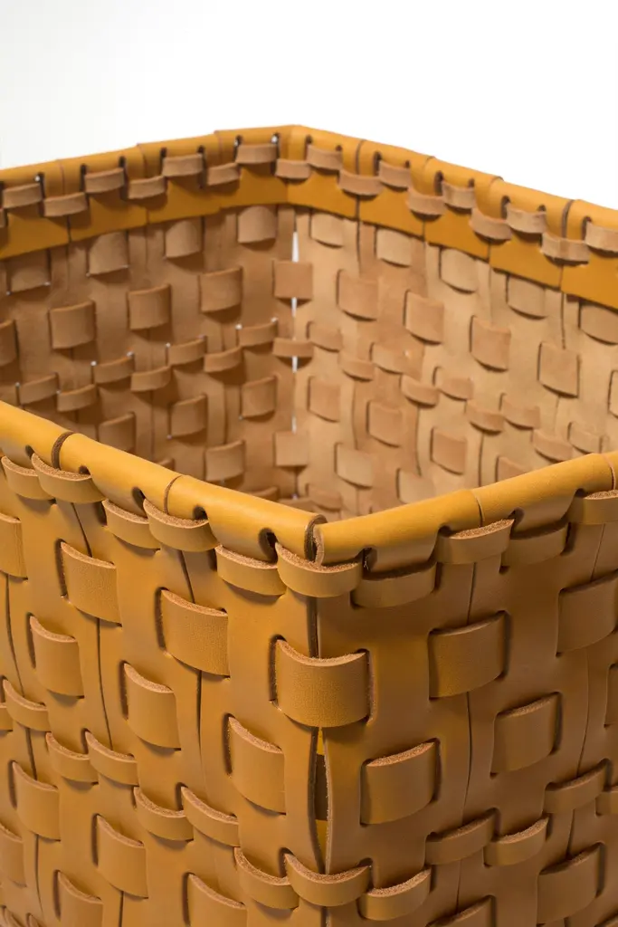 Baskets made using a weaving technique. Strips and bands of leather follow each other and bind together to shape the object. Available in the round (large and small), rectangular and square versions. Available colours: orange, white, blue, grey, khaki, ochre, elm, black, red, sole, dark brown, wine.