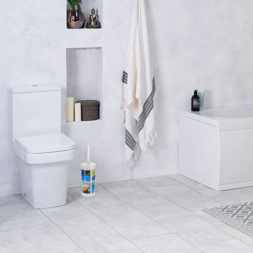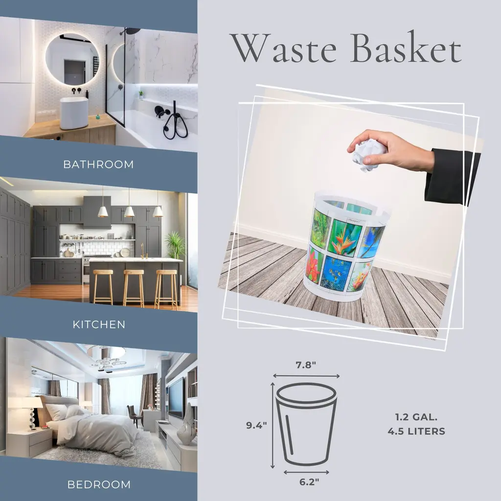 Vibrant Design: Brighten up your home with this paradise bathroom accessory set, featuring multicolor tropical scenes of ocean, palm trees, flowers, fruit and fishComplete Set: Includes wastepaper basket and toilet brush holder, ensuring a consistent look. An economical solution to keep your bathroom clean and organizedDurable Material: Made from 100% plastic, our lightweight bathroom set withstands daily use and looks like new for yearsIdeal Size: With a compact design, our 2-piece set fits perfectly in any bathroom. Trash bin: 9.4" x 7.8"" x 6.2". Toilet bowl brush: 13.8" x 3.8" x 3.8" Versatile Style: Perfectly complements any bathroom decor, from modern minimalism to eclectic interiors, enhancing your space with its colorful patternTransform your bathroom into Eden with our Tropical Paradise Bathroom Set. This colorful 2-piece set includes a decorative wastepaper basket and toilet brush, each adorned with a warm, sunny island motif. Durable plastic construction ensures longevity and resistance to daily wear and tear. Moreover, the 4.5-liter wastebasket stores ordinary bathroom waste while maintaining an elegant profile. Additionally, the toilet bowl cleaner comes with a discreet holder, keeping your bathroom clean and the brush out of sight when not in use. Furthermore, this bath set is easy to clean and maintain, for a hygienic bathroom. Also, this eye-catching bathroom essential set adds a touch of the exotic to your daily routine. Enjoy the perfect combination of utility and aesthetics with our Tropical Paradise Bathroom Set. Order now! Imported from France, Made in China
