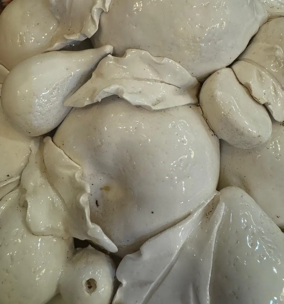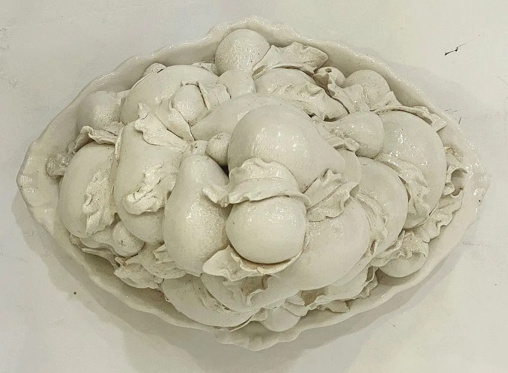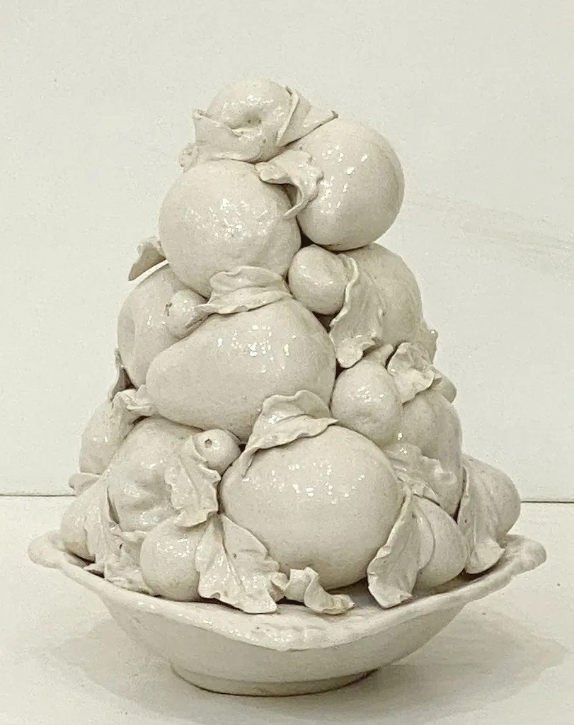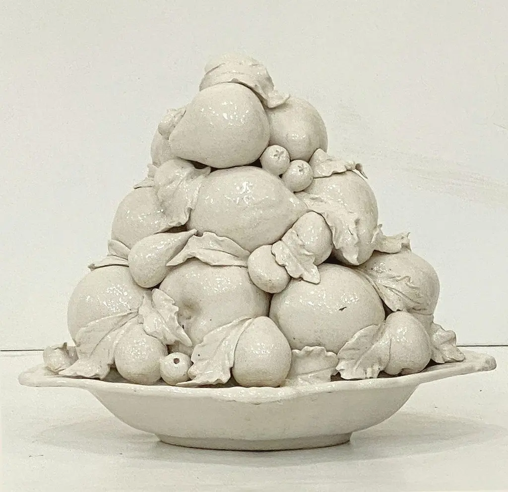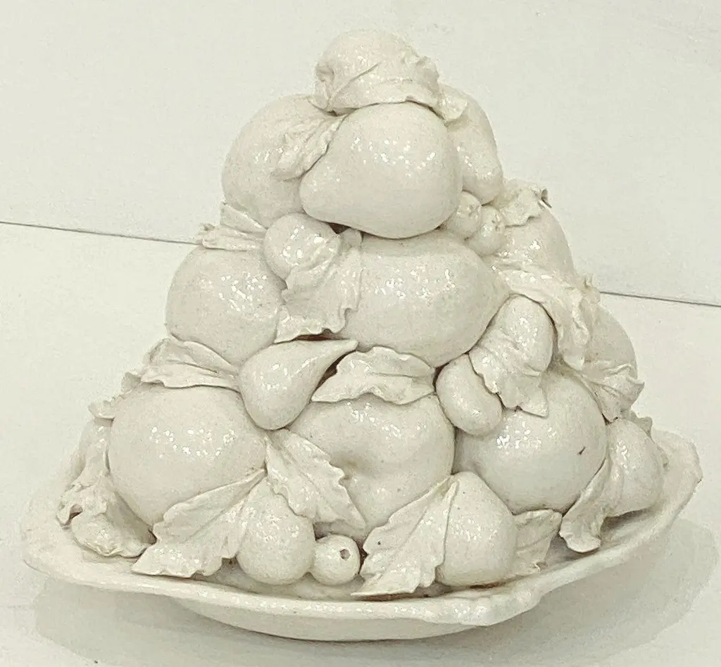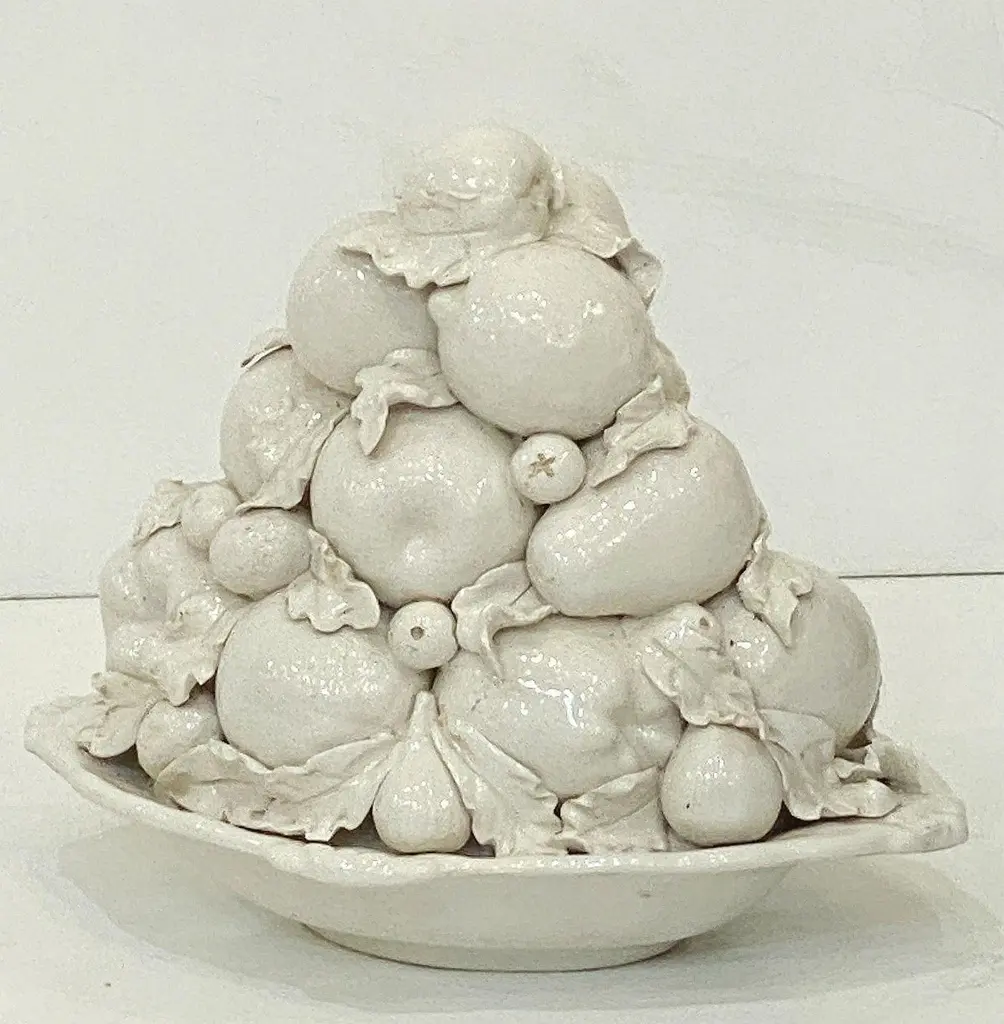 A fine large Italian cream-ware or white glazed ceramic 'bowl of fruit' basket or centerpiece with mixed fruit topiary top - featuring a relief of mixed fruits around the circumference of the top over a lower body in the shape of a raised oval bowl.Measures: Height 11 1/2 inches x Width 13 inches x Depth 9 3/4 inchesTwo available - Individually priced - $3895 each basket
