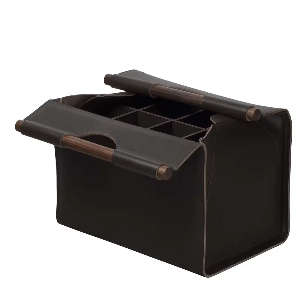 Handmade of the highest quality saddle leather, this vintage-inspired basket is beyond ordinary. Providing both style and function, it will fit in any interior with its rich brown color and natural texture. The tall, rectangular shape features eight compartments and a flap closure with two dowel handles made of rosewood. With an unconventional silhouette that evokes the old doctor's bag, this is a great storage solution by the fireplace for kindling, newspapers, matches, and firelighters, all in their own space, or it can simply be used as an interesting accent piece just as it is.