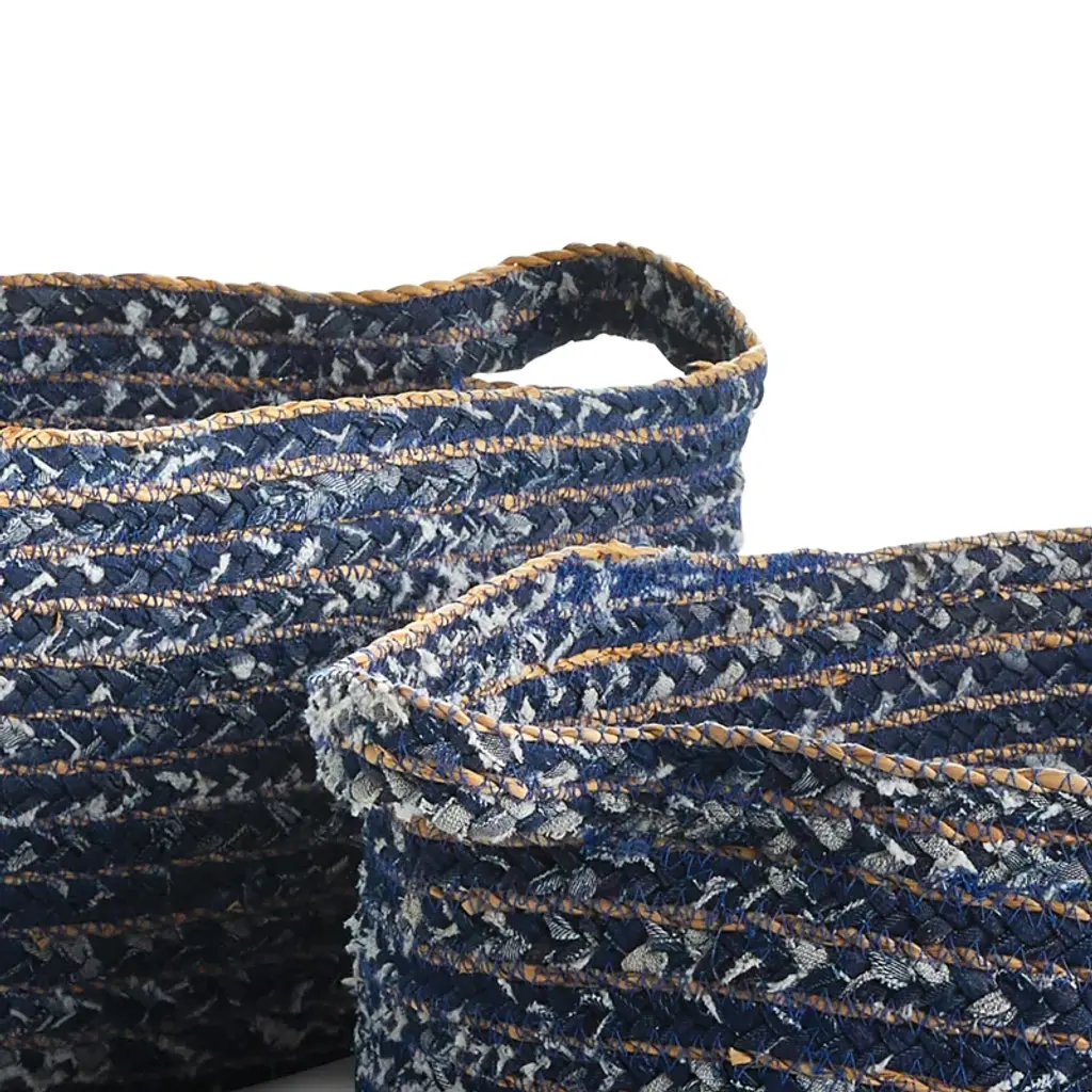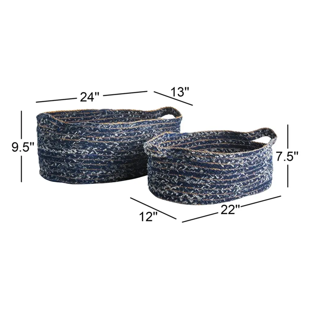 Made from recycled denim in the deepest of blue hues, this set of oval baskets doesn't just add storage, they also add a pop of color and rich texture to any space. Soft to the touch, they are great for towels, toys, or anything needing to be tucked away.