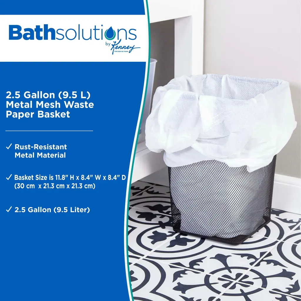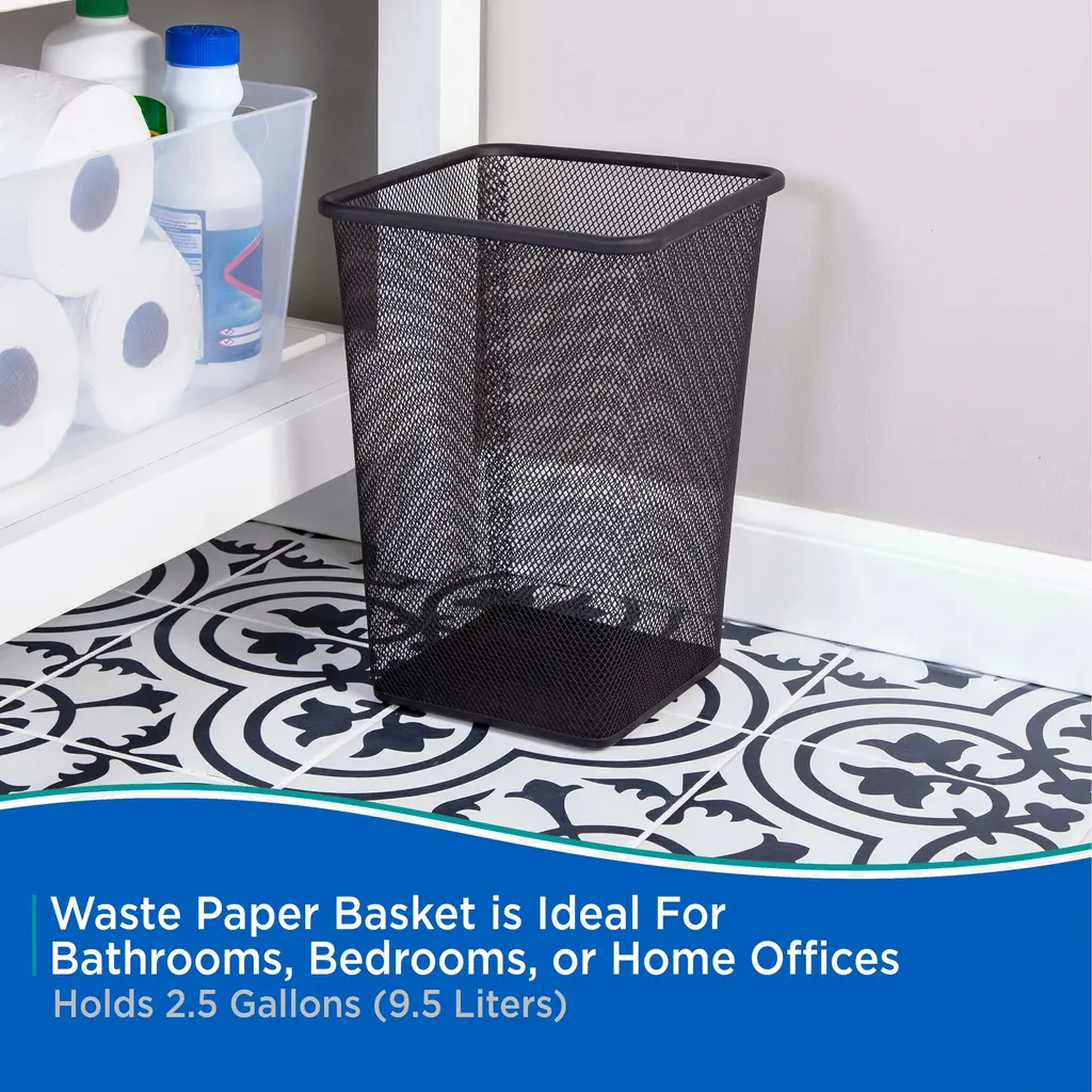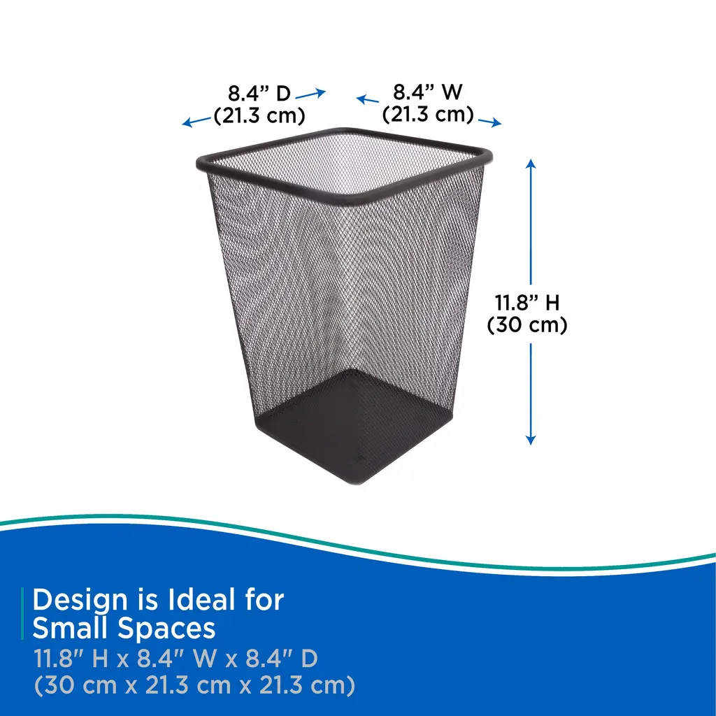 The Kenney Storage Made Simple Metal Mesh Waste Paper Basket is constructed out of steel and designed to be rust resistant. This open top square waste bin is designed to complement your home décor. It measures 8.4 inches across the top and 11.8 inches tall. This compact size is ideal for use in the bathroom, bedroom, or home office.