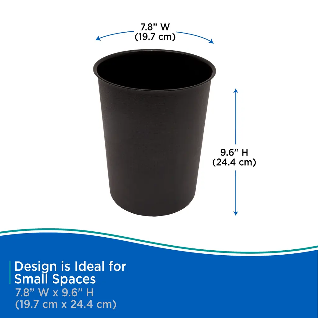 The Kenney Storage Made Simple Waste Paper Basket is constructed out of plastic and designed to be durable in use. It measures 7.75 inches in diameter and 9.6 inches tall. This compact size is ideal for use in the bathroom, bedroom, or home office. It can also be used for recyclable goods.