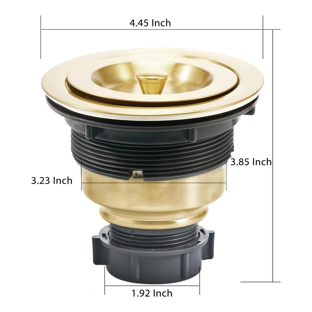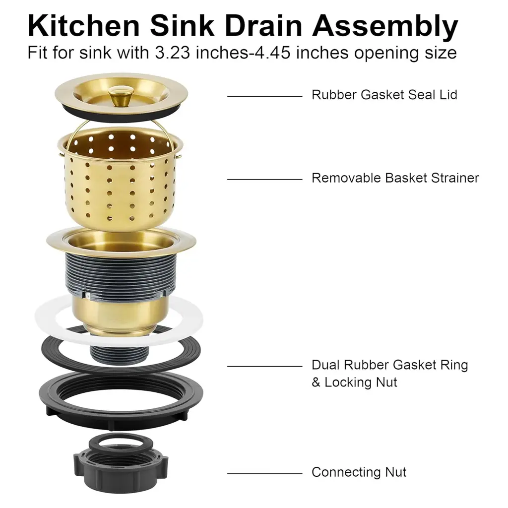 Features👍【Standard Size 3-1/2 inches Openings】: Fits most American family/commercial kitchen sinks. Fits sinks with 3.23 - 4.45 inches opening. Height of this kitchen sink drain is 3.85''. Please measure to ensure compatibility with existing plumbing before buying.👍【Stainless Steel Drain Assembly】: This black/Gold sink drain assembly is made of durable, premium 304 stainless steel that won’t rust when submerged for months. It uses a plastic nut to avoid corrosion, bonding the nut to the strainer.👍【Basket Drainer Design 】: The removable deep basket prevents debris from clogging the drain pipe and has a sealing lid to control water flow. Easy to clean—just remove the basket to empty (NOTE: The sink drain cannot be connected to the garbage disposal )👍【Easy to Installation】 : Package included all parts needed for installation. No need pumper putty. CB HOME gold/black/silver kitchen sink strainer are super easy to install within few minutes. Please contact with us if you need help.👍【What kind of sink can be used?】: Gold/Black/Silver kitchen sink drain is suitable for quartz farmhouse sink and kitchen sinks with stainless steel material. It's a long thread sink drain assembly.