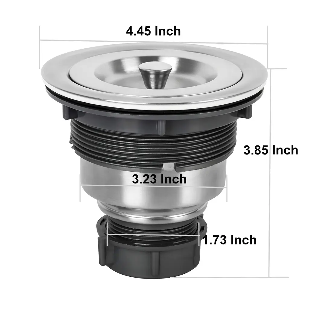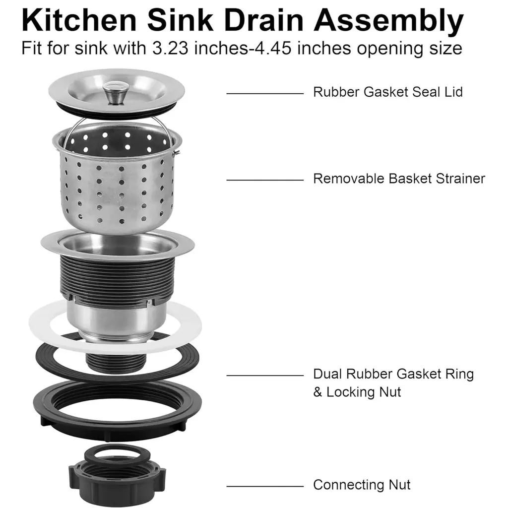 Features👍【Standard Size 3-1/2 inches Openings】: Fits most American family/commercial kitchen sinks. Fits sinks with 3.23 - 4.45 inches opening. Height of this kitchen sink drain is 3.85''. Please measure to ensure compatibility with existing plumbing before buying.👍【Stainless Steel Drain Assembly】: This black/Gold sink drain assembly is made of durable, premium 304 stainless steel that won’t rust when submerged for months. It uses a plastic nut to avoid corrosion, bonding the nut to the strainer.👍【Basket Drainer Design 】: The removable deep basket prevents debris from clogging the drain pipe and has a sealing lid to control water flow. Easy to clean—just remove the basket to empty (NOTE: The sink drain cannot be connected to the garbage disposal )👍【Easy to Installation】 : Package included all parts needed for installation. No need pumper putty. CB HOME gold/black/silver kitchen sink strainer are super easy to install within few minutes. Please contact with us if you need help.👍【What kind of sink can be used?】: Gold/Black/Silver kitchen sink drain is suitable for quartz farmhouse sink and kitchen sinks with stainless steel material. It's a long thread sink drain assembly.