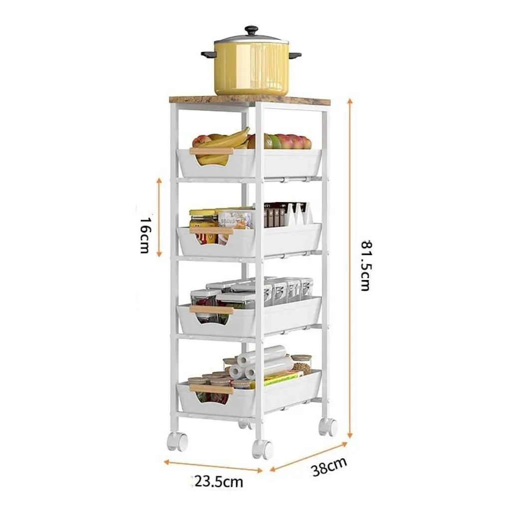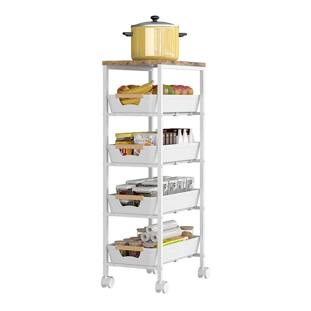 Organize your space effortlessly with this 5-tier metal utility cart with a stylish wood-look top. The four drawer baskets and sturdy top shelf provide storage for everything from kitchen appliances and fresh produce to office supplies and toys. Smooth-rolling wheels ensure easy movement between rooms, and two brakes keep the cart securely in place. Each piece is made from robust materials for reliable daily use, and the adjustable, ventilated design keeps items accessible and fresh.