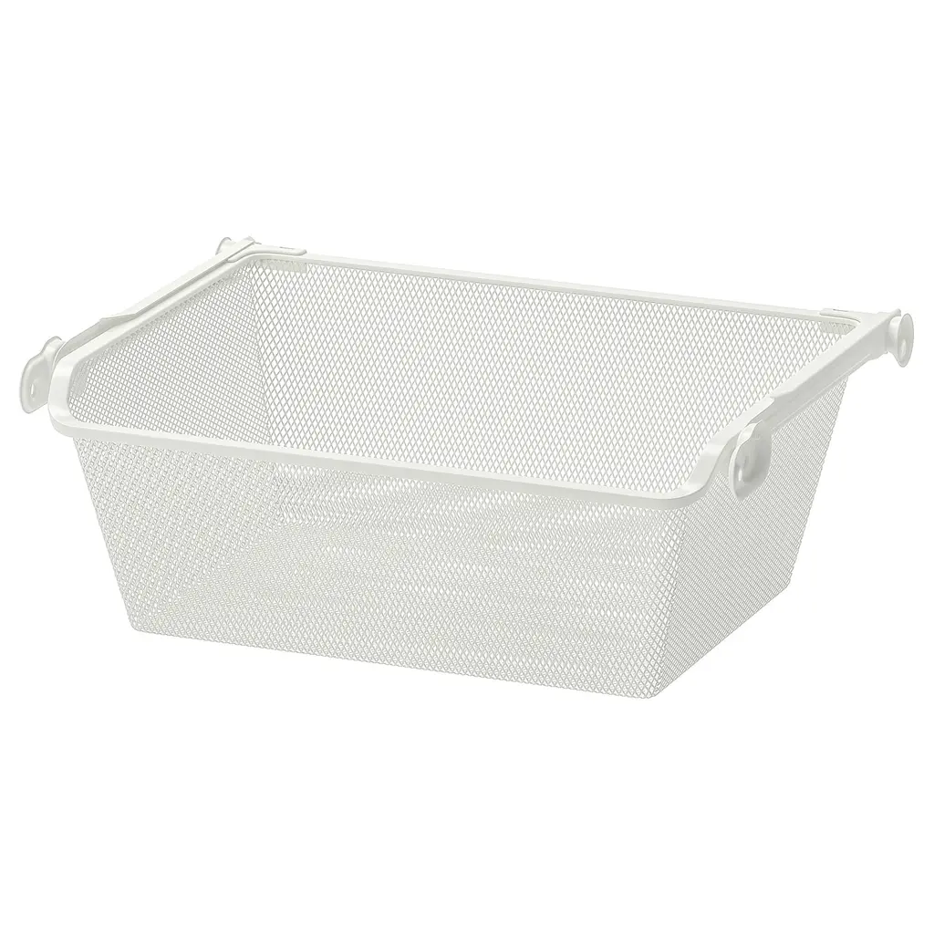 KOMPLEMENT Mesh basket with pull-out rail - white 19 5/8x13 3/4 ". 10-year Limited Warranty. Read about the terms in the Limited Warranty brochure. The mesh basket allows air to circulate and is perfect for storing your folded clothes, socks or accessories. Available in different widths and depths.